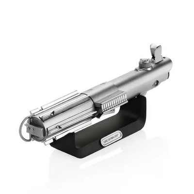 This 1/1 scale replica not only duplicates the flanged grip and technical interfaces of the Skywalker heirloom, a twist of the grip reveals an internal cavity for documents.