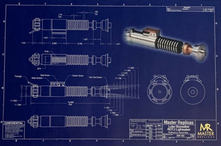 This Art Print from Master Replicas (reference SW-002) represents a blueprint of Luke Skywalker’s lightsaber in Return of the Jedi.
