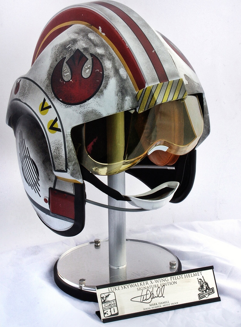 The original helmet was made from an APH-6B Vietnam era flight helmet used by the US Navy, circa 1969. This helmet included the dual visor cover. A ridge was also added over the top from front to back. The helmet was then cast in halves to make the master pattern and the X-wing pilot helmets were then vacuum formed from these patterns. Upon assembly, a strip of ABS was added to hide the parting line of the two halves.