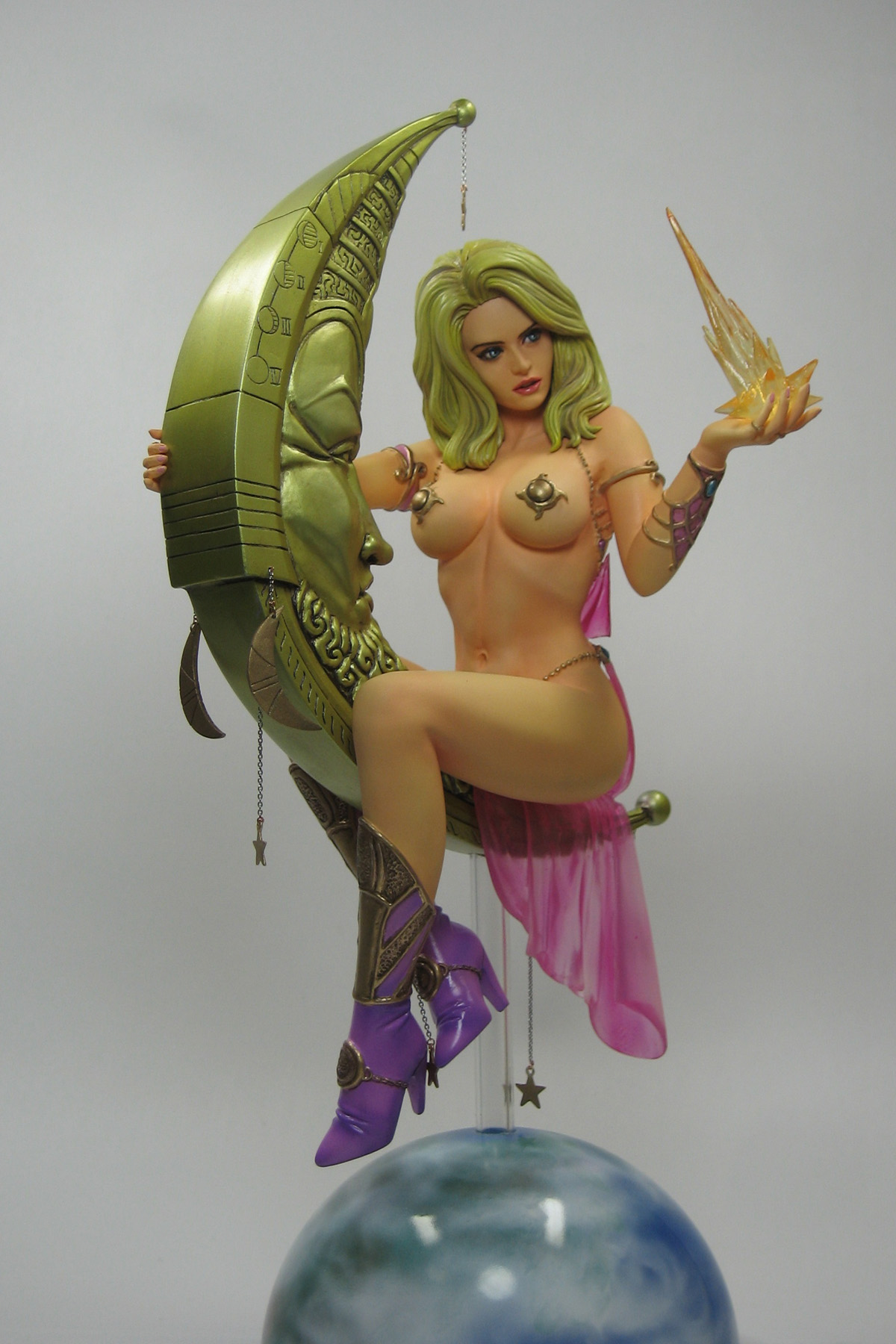 Why wish upon a star, when Yamato USA can make your dreams come true with the latest installation in its Fantasy Figure Gallery… LUNA! Inspired by the art of Dorian Cleavanger and brought to three-dimensional life by sculptor Takuaki Tsushima, Luna balances playfully upon an elaborate, art deco inspired crescent man-on-the-moon as she nonchalantly plucks a falling star from the evening sky. This heavenly PVC statue of Luna measures 7.75” while sitting (9.75” from themed base to tip of the moon) and features translucent parts to convey the sheerness of her garments, as well as strategically placed cast-off parts. Window boxed, Yamato USA’s Fantasy Figure Gallery: Luna (Dorian Cleavenger) also comes complete with art card and certificate of authenticity
