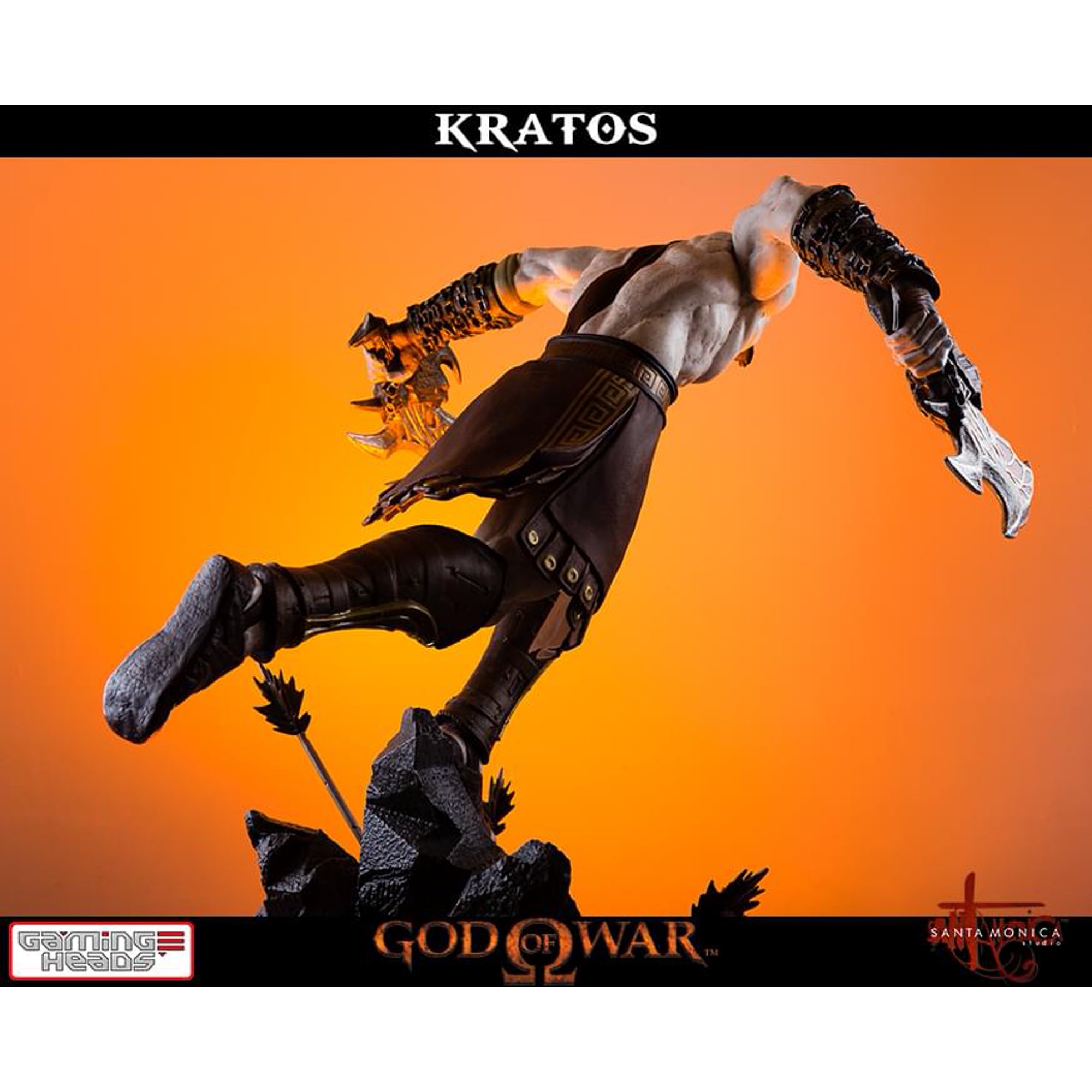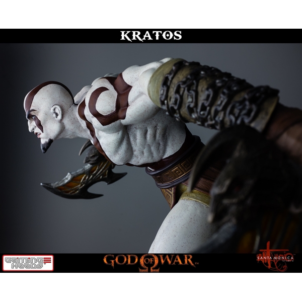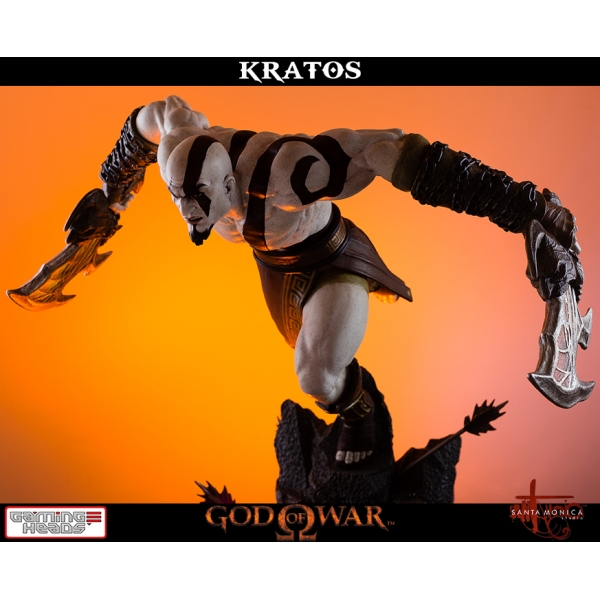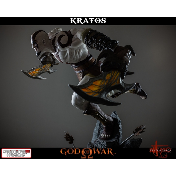 Gaming Heads is proud to reveal Kratos: the protagonist of the God of War series. Kratos has been portrayed in 1/4 scale, wielding the Swords of Chaos, and has been captured lunging forward in a powerful attack. Standing at 19 inches tall when leaping forward on his base, this depiction of Kratos is a truly massive recreation.