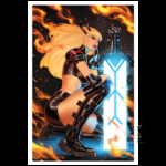 Illyana Rasputin is one hell of a sorceress! In this infernal illustration, the mystic mutant plunges the Soulsword, a magical weapon forged from her own lifeforce, into the ground beneath her. She wears her classic black leather costume as fire roars all around this dark and destitute dimension. At home in the wicked blaze, Illyana simply smirks and sets her red eyes on a new target. Which demonic entity will meet her blade next?