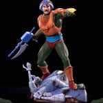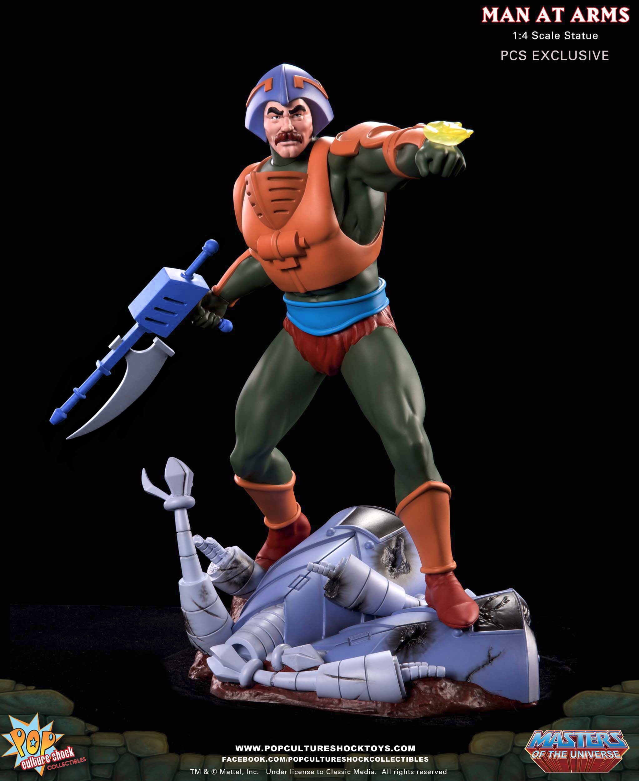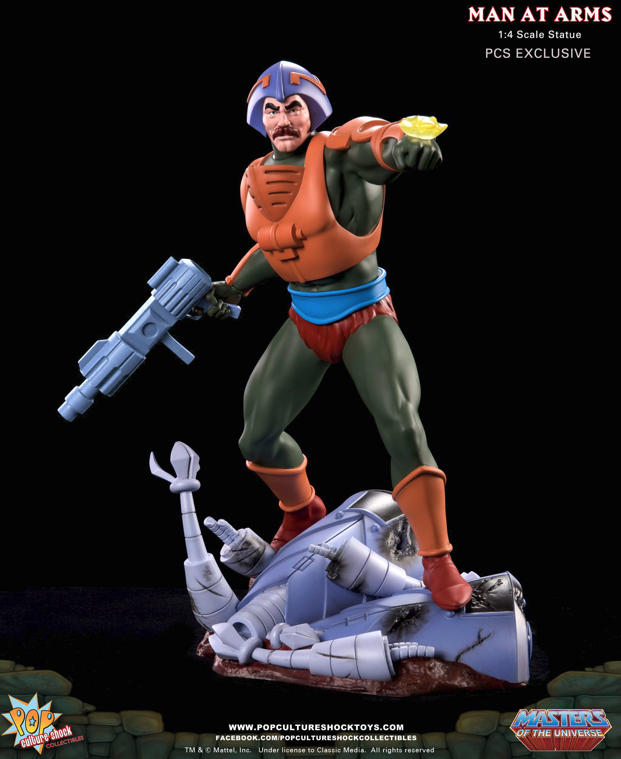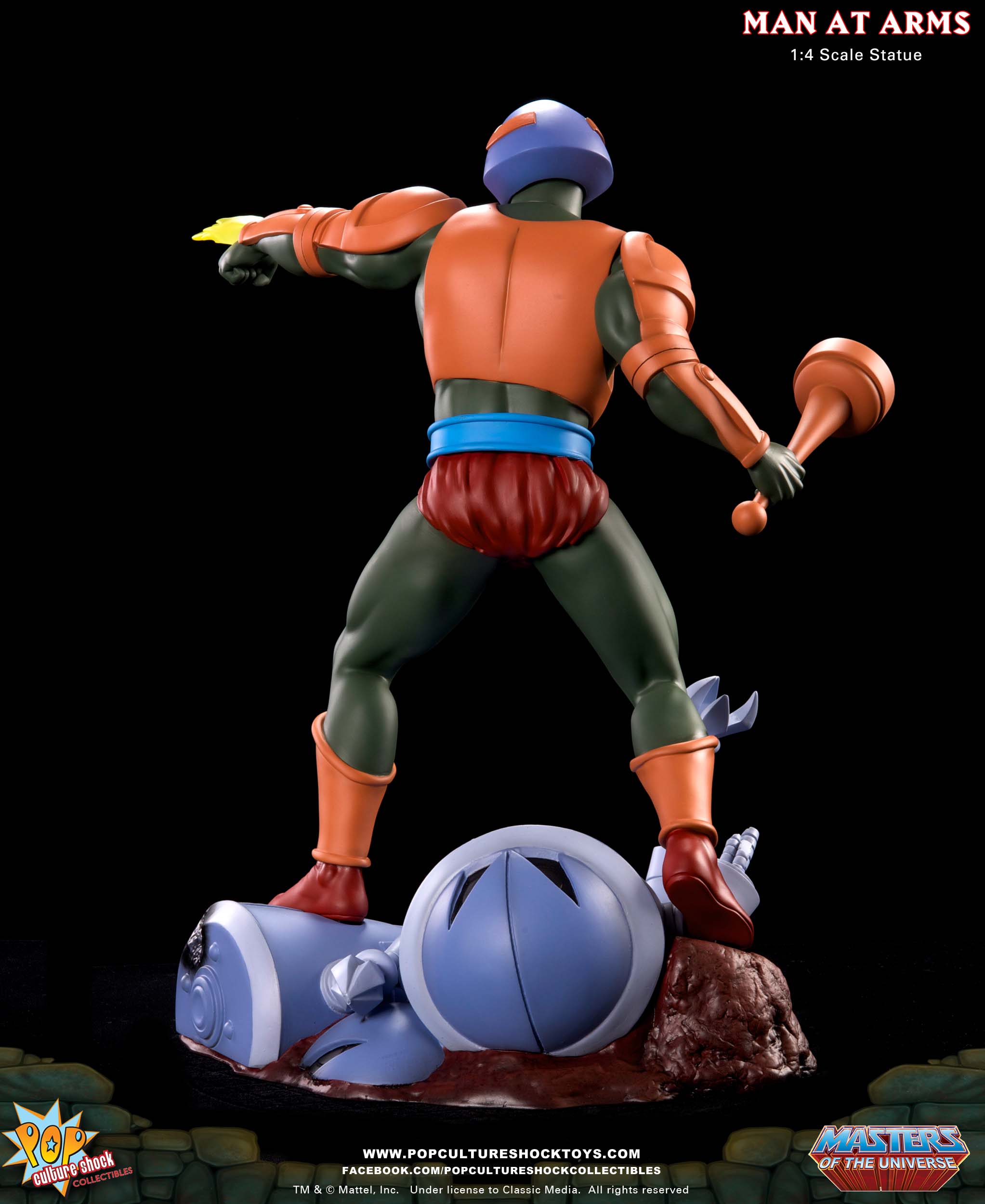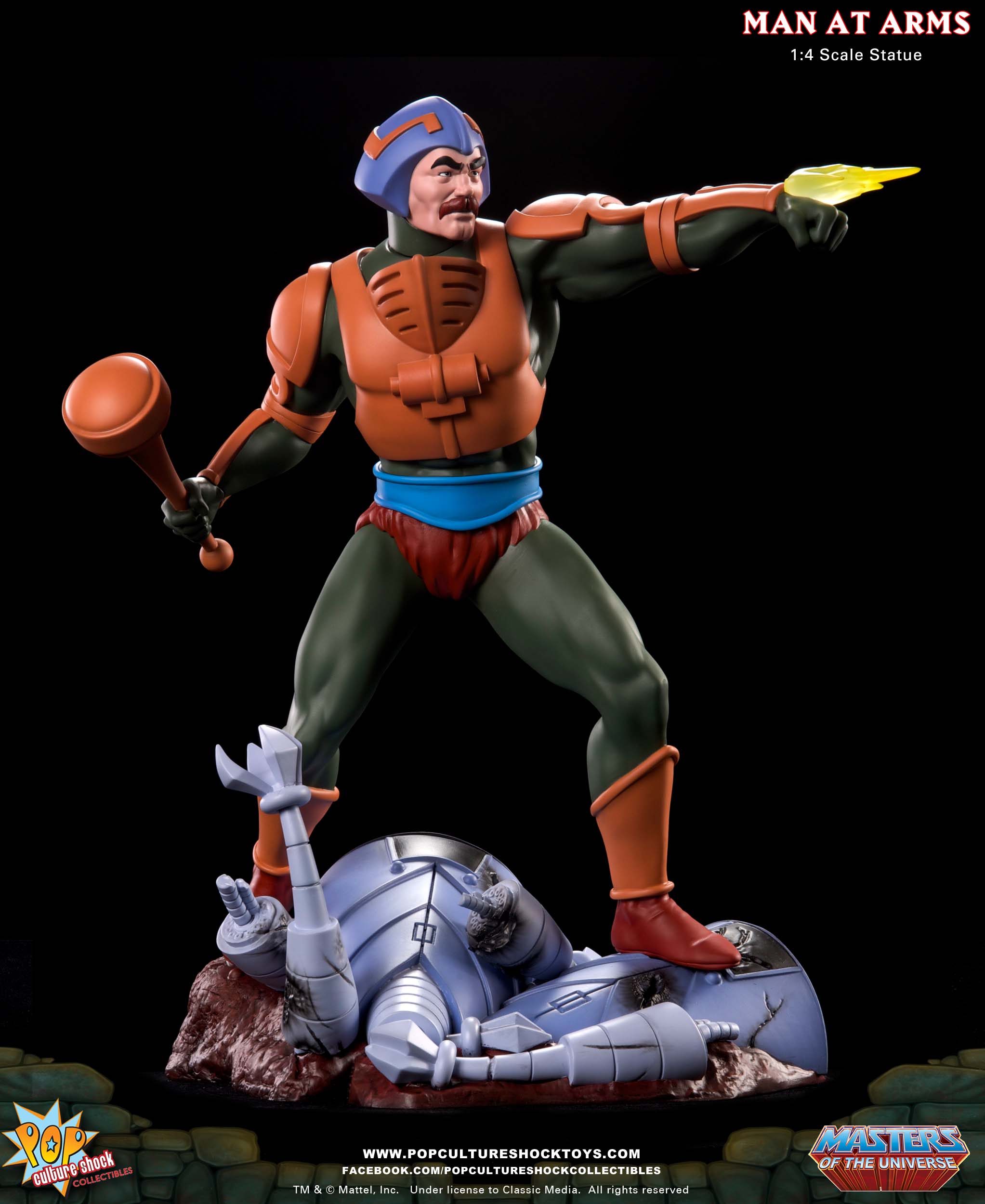 The statue is stylized version of the Filmation Cartoon version of Man-At-Arms, showing him in a pose similar to his appearance in the cartoon intro. The polystone statue will stand at 17″ tall.