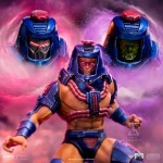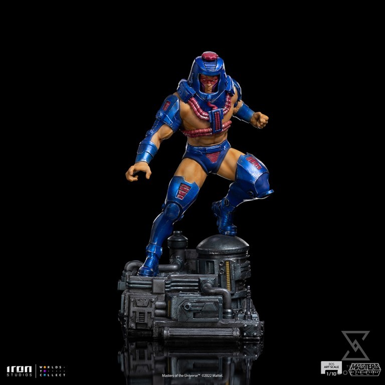Climbing on a base formed by mechanical and technological elements, Eternia’s heroic warrior of many faces reveals himself ready for action. As a futuristic gladiator, he uses blue armor with lilac details, filled with cybernetic aspects, that cover his arms and legs, and he also brings a big helmet on his head on which his many faces appear in its front opening. Iron Studios present another statue from their successful line based on the classic MOTU franchise with “Man-E-Faces – Masters of the Universe – Art Scale 1/10”, the three-in-one hero, part man, part monster, and part robot, remarkable by his distinctive powers and look. The statue presents the same mechanism as the original figure, changing its faces when turning the gear on top of his head.