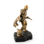 24K gilding lends a luxe finish to one of the Bounty Hunters’ Guild’s most efficient operatives and his young charge. Base in composite resin.