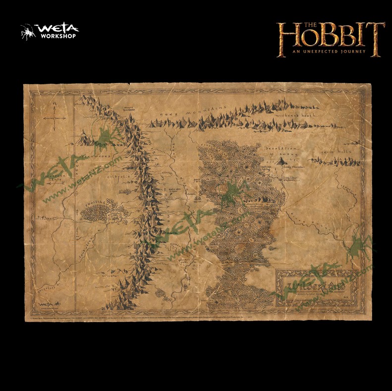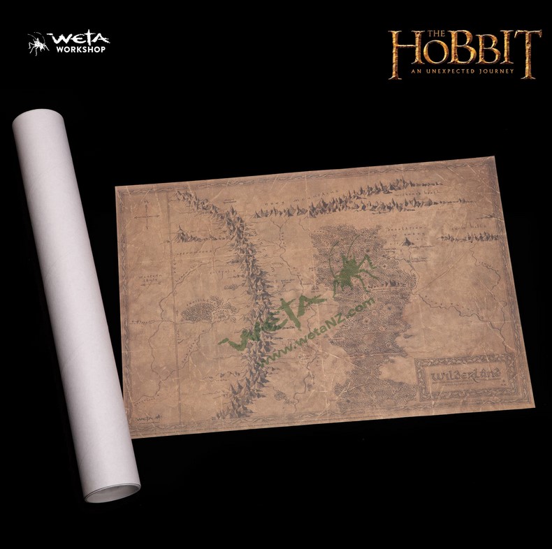 The original prop for The Hobbit: An Unexpected Journey was designed and drawn by Daniel Reeve of the 3 Foot 7 art department. Weta’s map has been made from a scan of the original map and printed in Middle-earth (New Zealand) on finest Italian Marina Conchiglia parchment paper. Map of Wilderland – Parchment Art Print is a very cool piece of art.