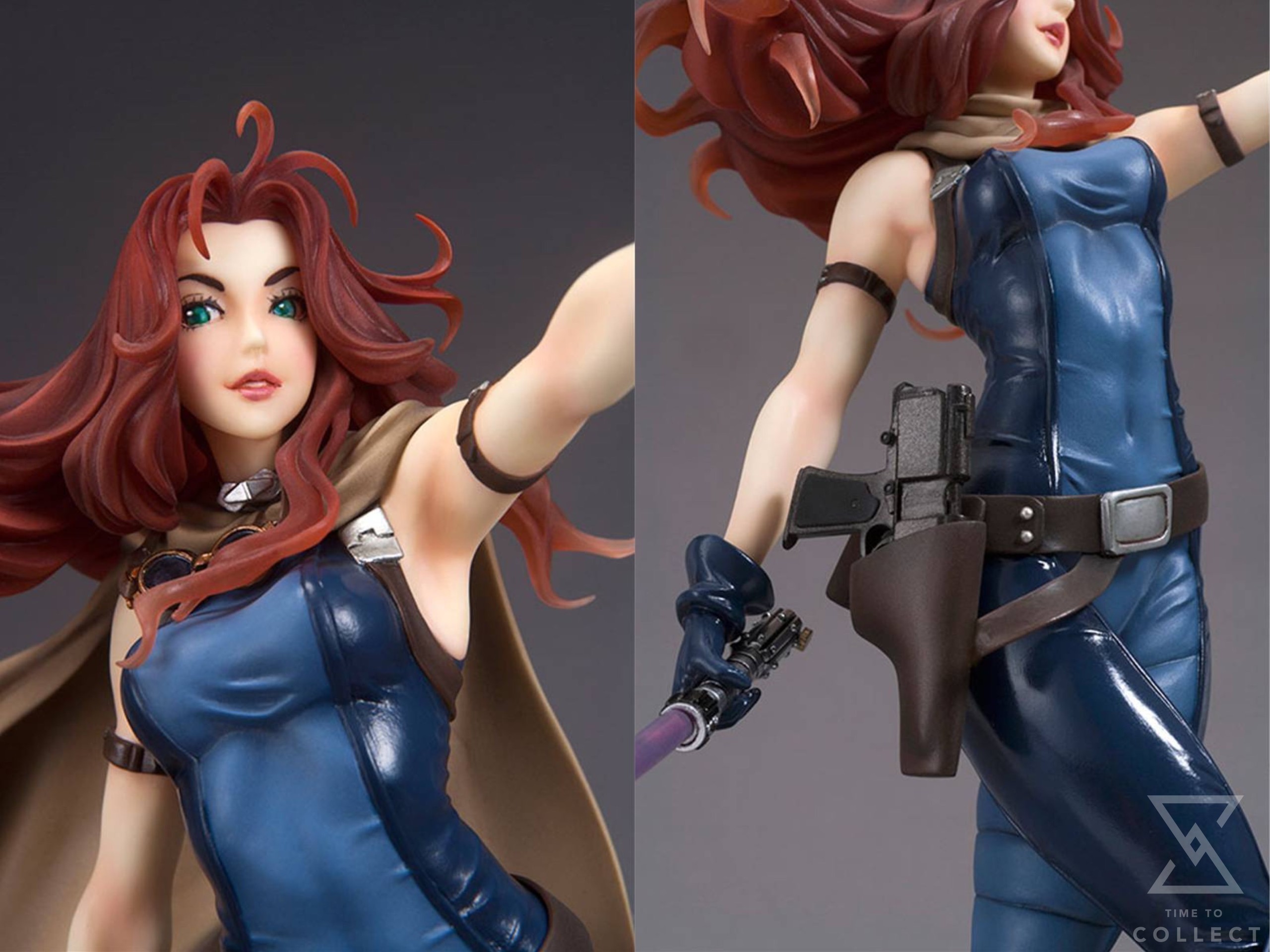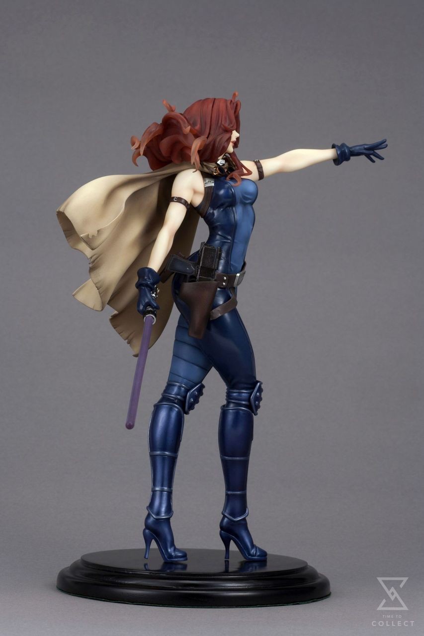 The assassin turned Jedi wears a unique outfit consisting of a skin-tight two-tone blue suit with integrated high-heeled boots and bare arms. Mara is ready for anything with a large blaster in a holster at her waist and a lightsaber held casually in her right hand. She is captured in a walking pose with her other hand held out in front of her, ready to batter her enemies with the Force. Mara shows off the high quality you’ve come to expect from Kotobukiya with a highly detailed sculpt and paint applications, particularly focusing on her beautiful Bishoujo-inspired face and flowing red hair. As an added bonus, you can display the heroine in various ways with or without her removable cape, and she comes with two different lightsabers: her original purple blade and Luke’s original lightsaber given to her in the novels!