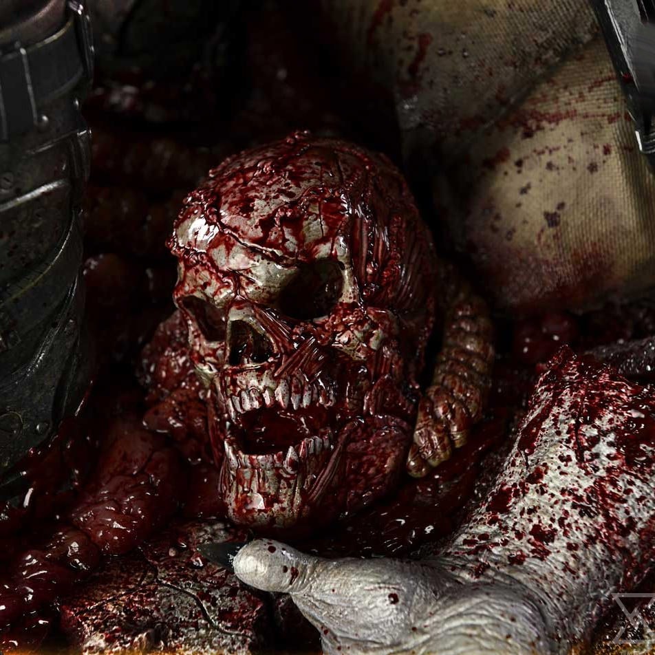 From his blue-gray eyes and the scar on his right cheek to the rugged set of his features, Marcus’ tough portrait feels strikingly lifelike. The COG armor is sculpted with textures differentiated by material, then finished with weathering suited to harsh conditions. Even the Lancer’s heavy presence is rendered convincingly, down to the realistic tone of blood caked onto the chainsaw.