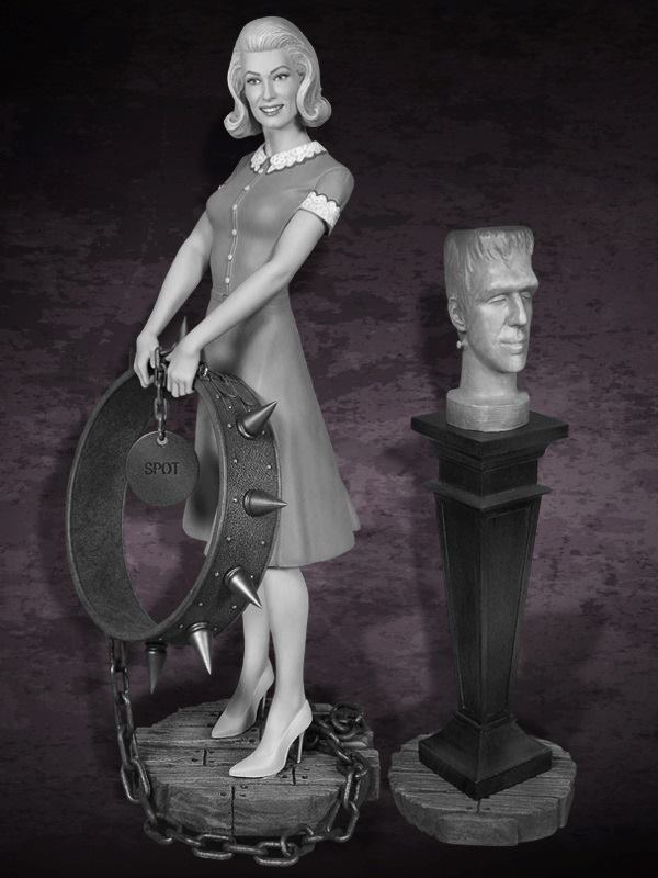 The sixth scale maquette features Marilyn holding Spot’s collar and includes a bust of the character sculpted in The Munsters episode “Prehistoric Munster.”