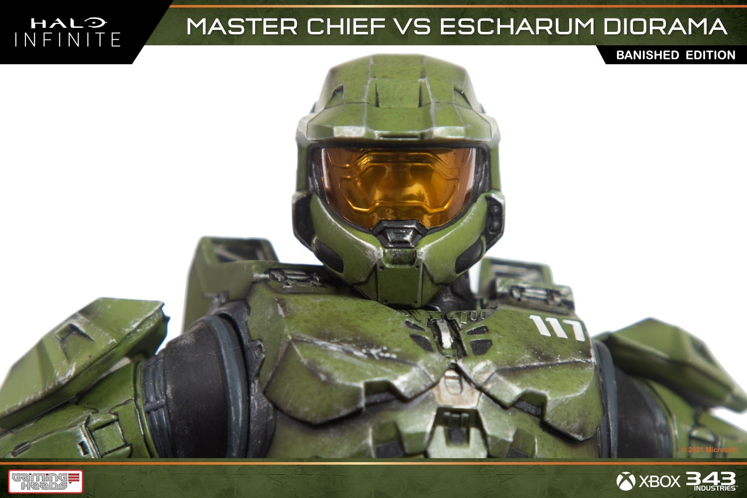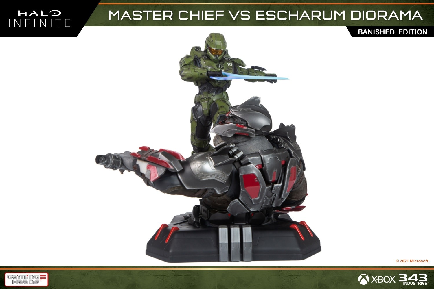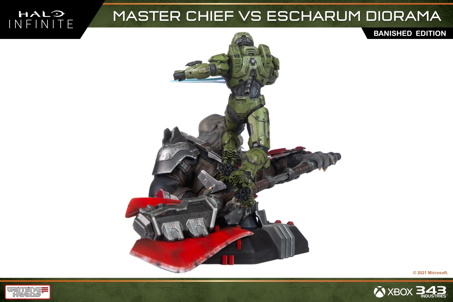 The Banished edition Master Chief v Escharum diorama is only available here at Gaming Heads. The diorama shows the Master Chief with his signature blue Energy Sword and Escharum with battle damage to his helmet and distorted facial features. It also includes the parts that come with the Standard edition diorama, which are the Master Chief holding his trademark MA40 assault rifle while Escharum has an undamaged helmet and determined facial expression while wielding his personal Gravity Axe. Additionally, the design of the base was inspired by visual elements found in Halo Infinite.