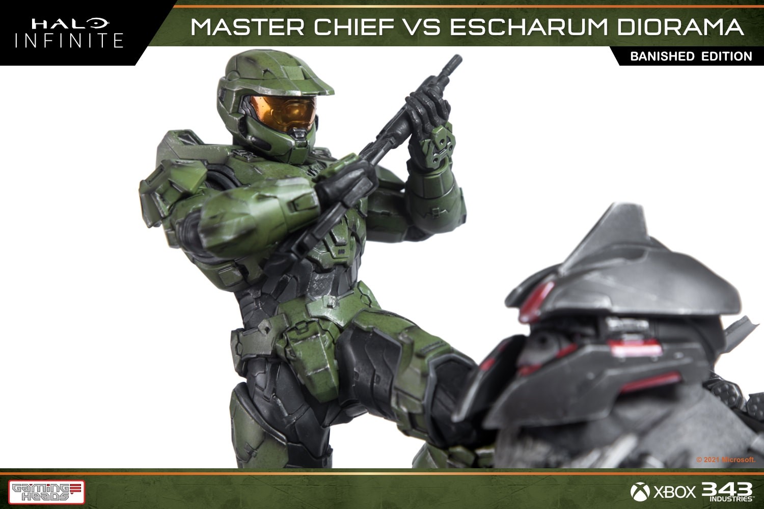 The Banished edition Master Chief v Escharum diorama is also available in a Standard and a UNSC edition dioramas. The Master Chief v Escharum (UNSC edition) diorama comes with additional interchangeable parts. Each diorama comes in deluxe full-color packaging, has a validation card and a hand-numbered base.