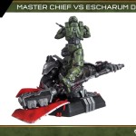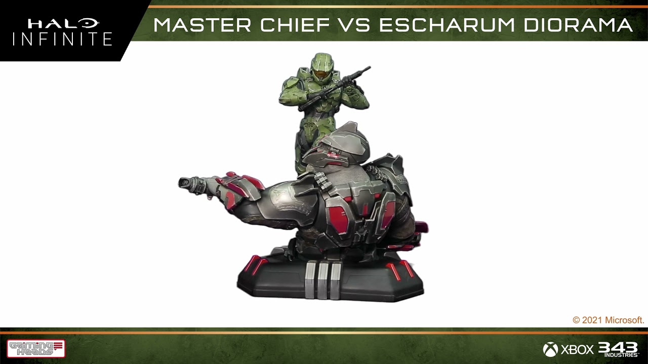 The Master Chief v Escharum diorama has Master Chief holding his trademark MA40 assault rifle while Escharum wields his personal Gravity Axe. Additionally, the design of the base was also inspired by visual elements found within Halo Infinite.