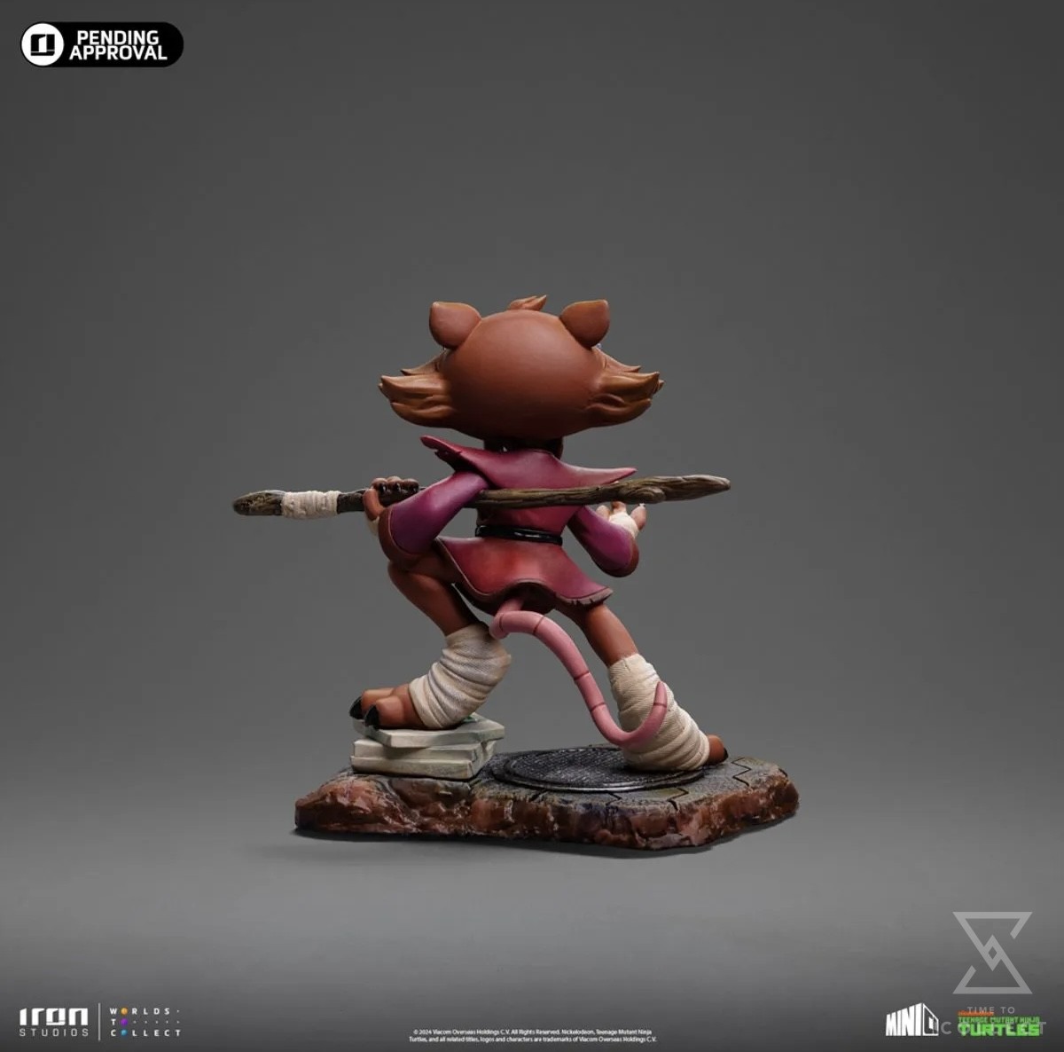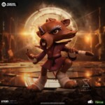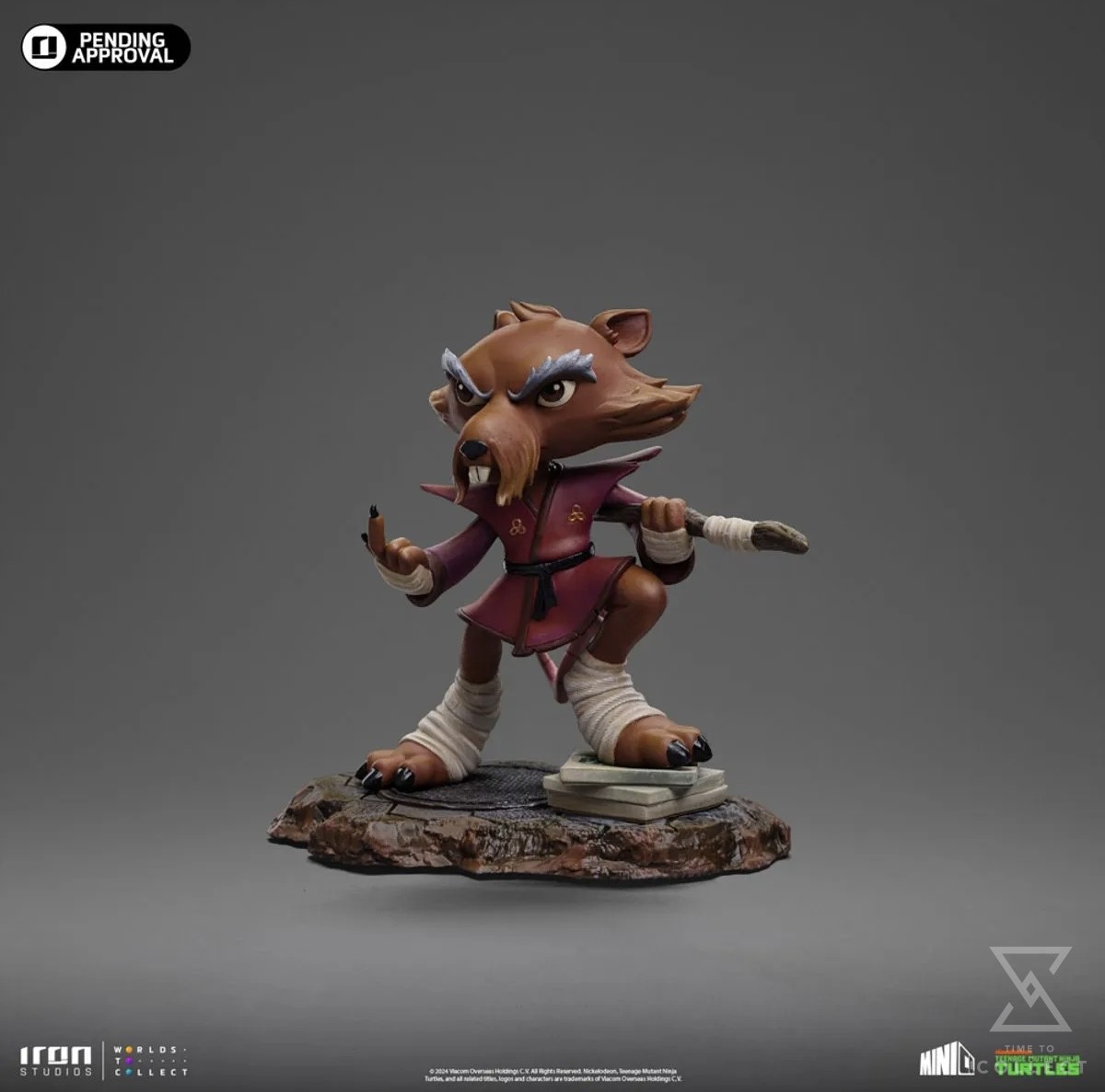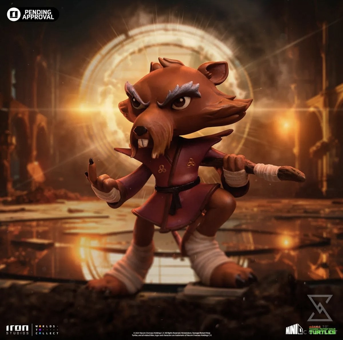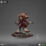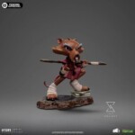 Ready for action, the wisest and most skilled anthropomorphic mutant rodent in New York fearlessly calls his opponents with the small index finger from his right hand, prepared to repel or attack with his staff positioned between his back and under his left arm, ready to be used like a Japanese Bō staff. A great master of Ninjutsu, dressed in his worn-out maroon kimono and black belt, the elderly brown-furred rat with long gray eyebrows rests his right leg on a pile of pizza boxes left by his adopted sons. Iron Studios presents the “Master Splinter – TMNT – MiniCo” statue, featuring the sensei of the four brother turtles who protect the city, in a Toy-Art style that has already won the hearts of fans and collectors worldwide!