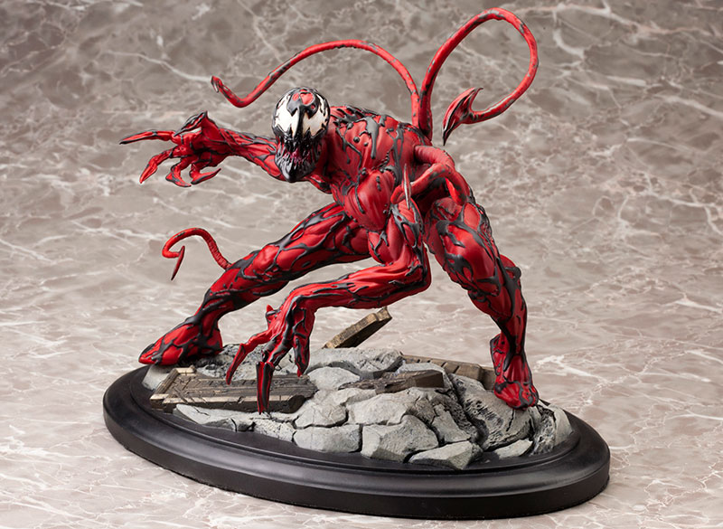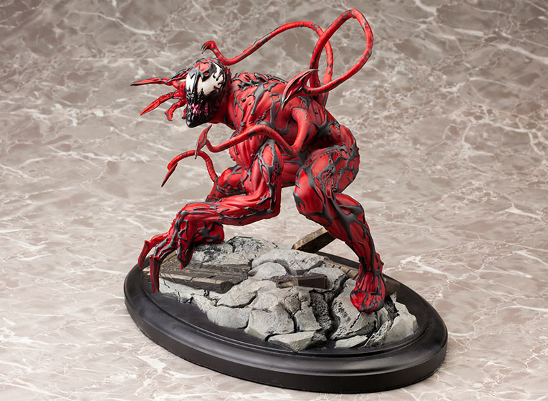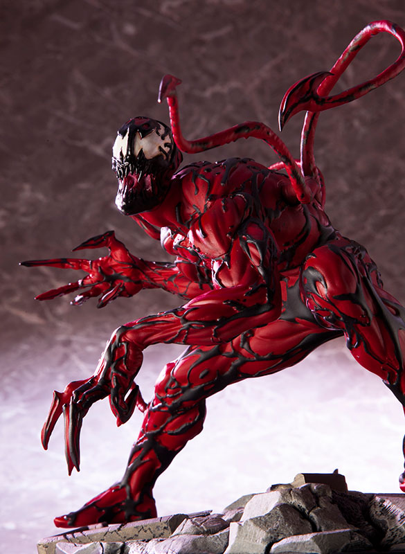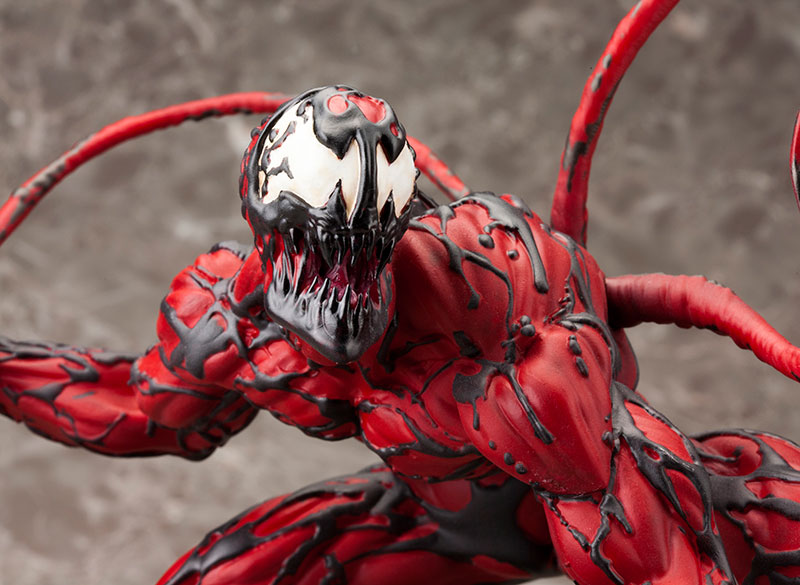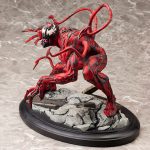 Sculpted by Erick Sosa (renowned for his work on the Spider-Man Unleashed and Venom Unbound Fine Art Statues), the 1/6 scale Maximum Carnage is just over 9 inches tall in his crouching pose. With his eye-catching color scheme and terrifying appearance Carnage looks great on his own and even better alongside other Marvel Comics Fine Art Statues from Kotobukiya!