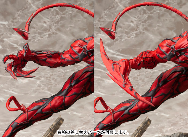As ever intent on mayhem and bloodshed, the ruthless symbiote prowls across a broken cityscape in search of its next victim. Carnage is creepy and scary at the same time, appearing as a heavily muscled blood red humanoid covered in black webbing and brandishing wicked claws, tendrils sprouting from its back and leg, and a monstrous face. Kasady creeps along, crouching low as he scuttles across debris while his three barbed prehensile stalks wave in the air. The intricately detailed musculature and webbing are sculpted to perfection as you’ll only find on a Kotobukiya Fine Art Statue, not to mention the creature’s perfectly rendered enormous eyes and gaping maw. You can even customize your Carnage display with interchangeable parts to have his right arm end in a clawed hand or a spiked weapon!