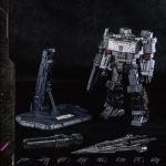 At 10 inches (25.4cm) tall, the Transformers: War For Cybertron Trilogy – DLX Megatron collectible figure features approximately 50 points of articulation, a die-cast metal frame, and LED illuminated eyes and body. Accessories include D50-R35 Fusion Cannon, HPR Telescopic Laserstrike Launcher, a total of five pairs of interchangeable hands, and a DLX Action Stand for various expressive poses. The two weapon accessories are able to combine, forming the impressive NFM Particle Beam Mega-Launcher. Like other DLX series figures, Megatron also features a die-cast metal frame for increased playability, with a finely-detailed paint application that showcases the war-torn weathered look as seen in the Transformers: War For Cybertron Trilogy.