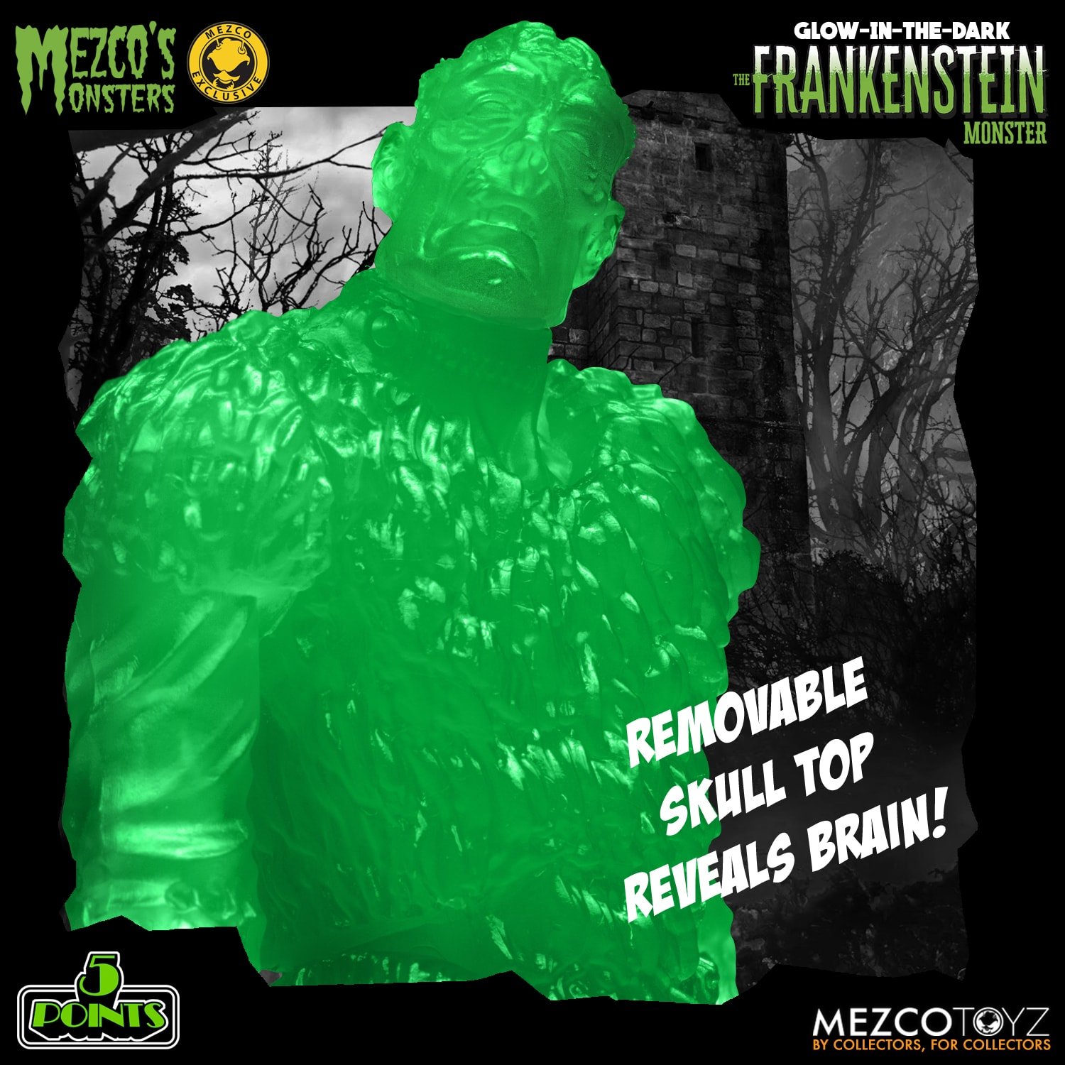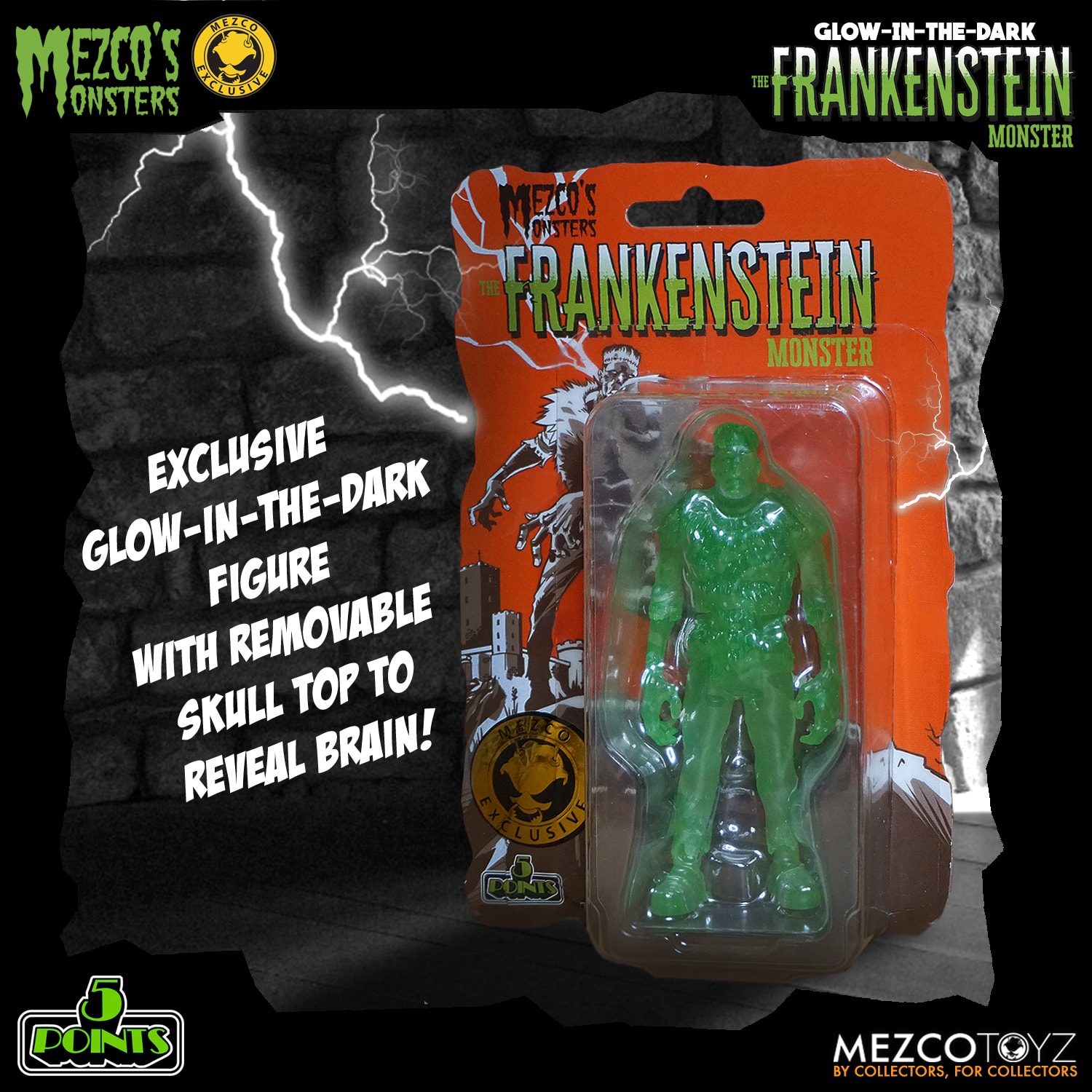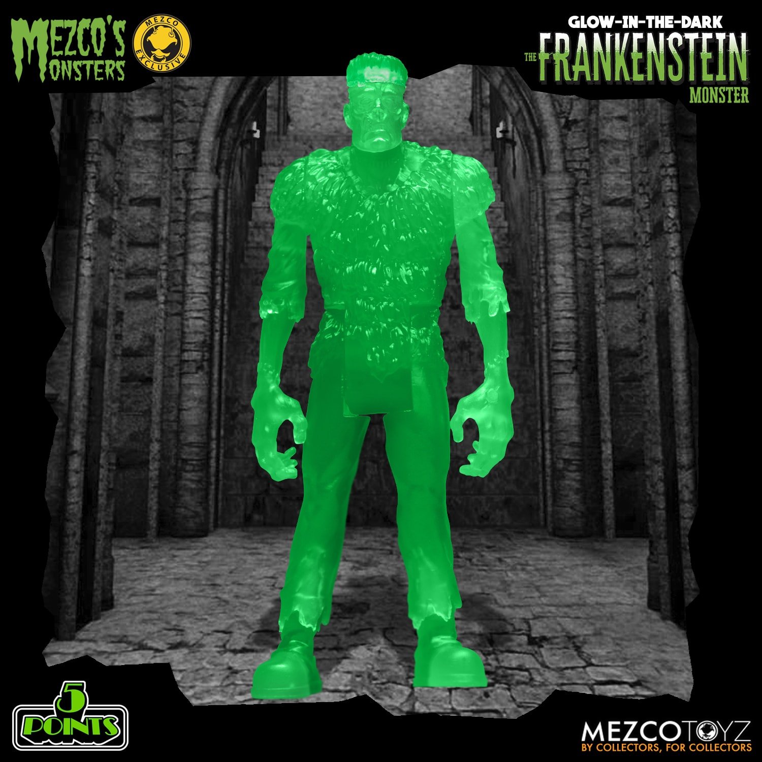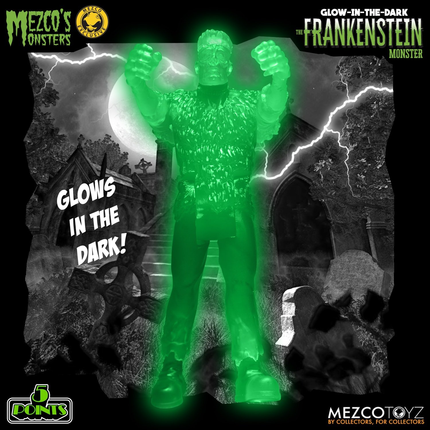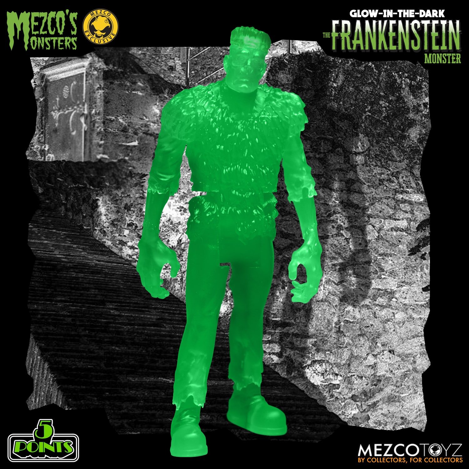 The 5 Points Mezco’s Monsters: Glow-in-the-Dark The Frankenstein Monster is packaged on a retro blister card, perfect for display.