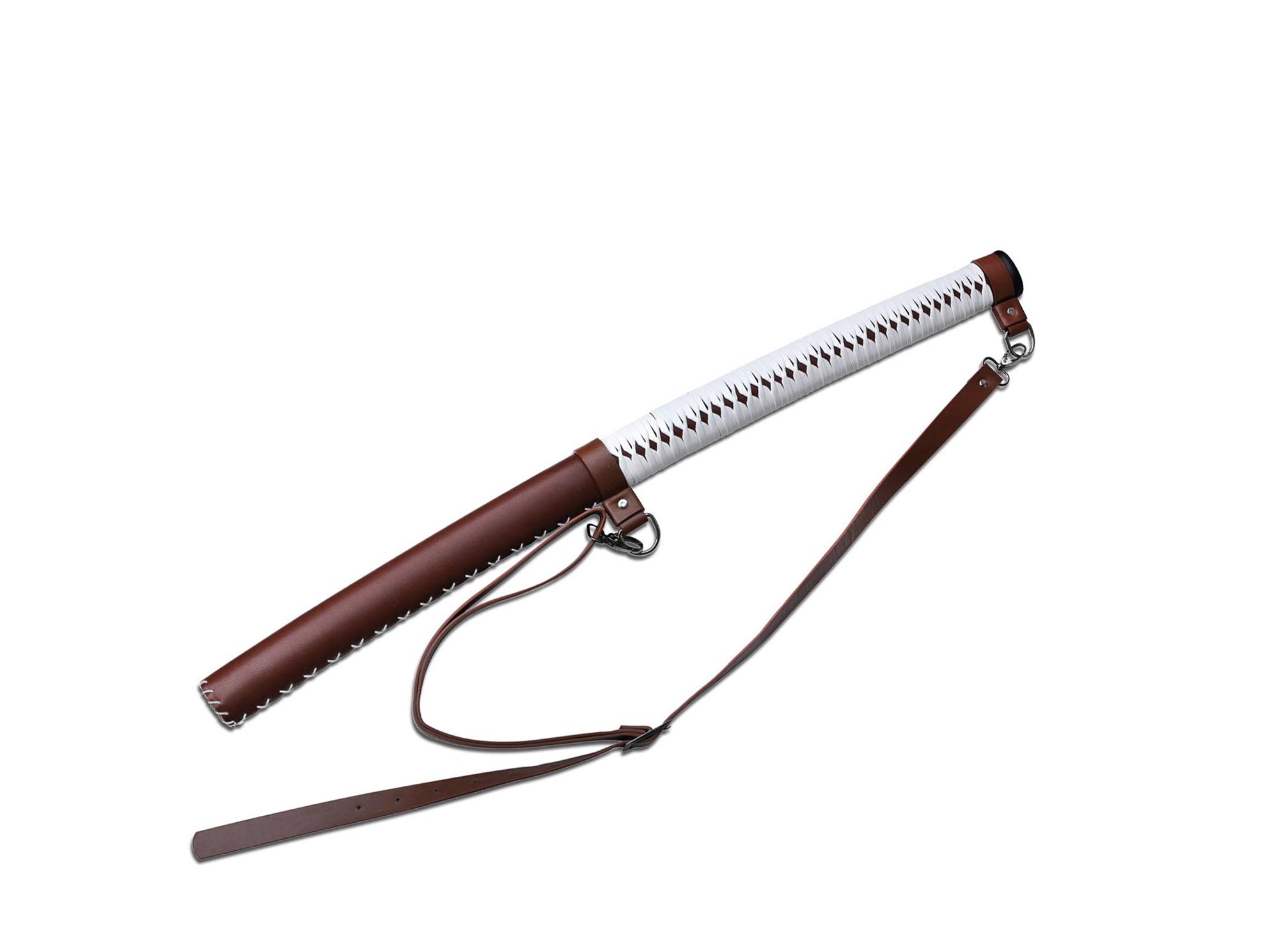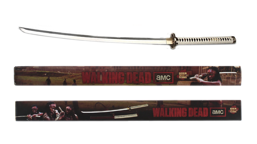 A Carbon Steel Michonne Katana Samurai Sword by Master Cutlery. This item is part of the 1st production (MC-WD001) and is accompanied by a Certificate of Authenticity, indicating it is out of 2000. The handle has traditional fittings, a ray skin covered handle and leather cord wrapping; includes a leather covered, cord wrapped, hard scabbard with back strap so it can be carried just like Michonne does in the TV series! The overall length is 41″. Don’t miss out on this RARE, hard to find piece!