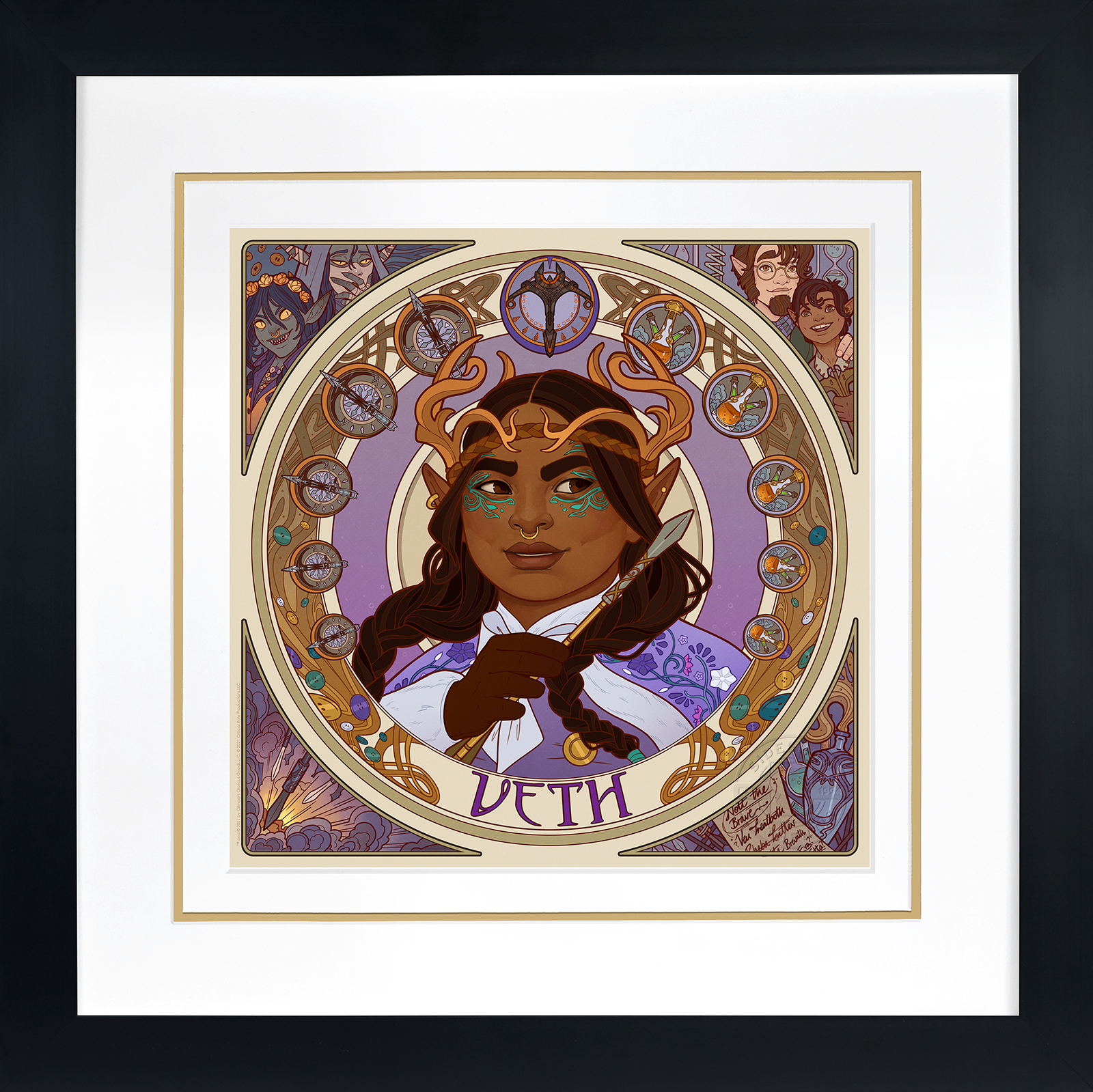 Inspired by Art Nouveau portraiture, Sam Hogg captures the beauty, brilliance, and badassery of the heroes of Critical Role: Campaign 2 in this collectible art series. The Veth Fine Art Print reveals the Mighty Nein’s impish Thief in her true form as a fearless, high-leveled hero. Veth Brenatto stands in the center of an explosive array of trinkets, tinkerings, and tinctures reflecting her adventures through Wildemount — including Yeza and Luc, a glimpse at her Goblin visage, a volley of incendiary ammunition, and reminders of her time as Nott the Brave. This illustration is bursting with Easter eggs, so break out your best detective skills to spot them all.
