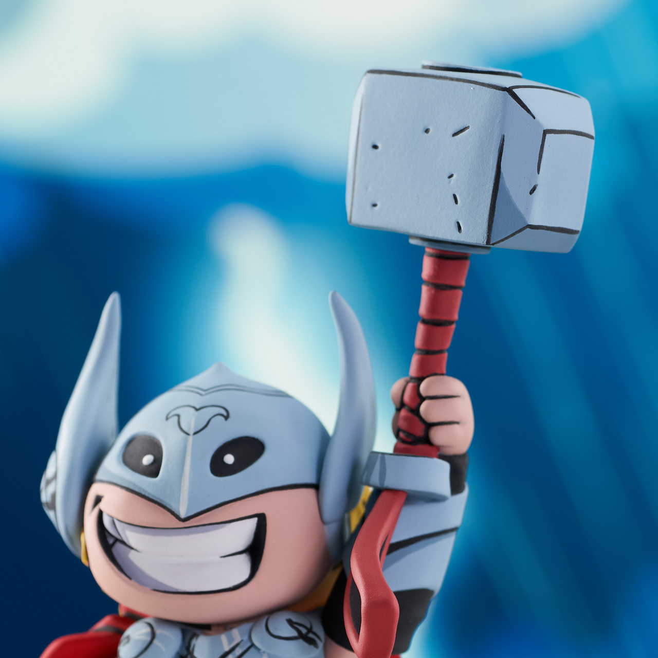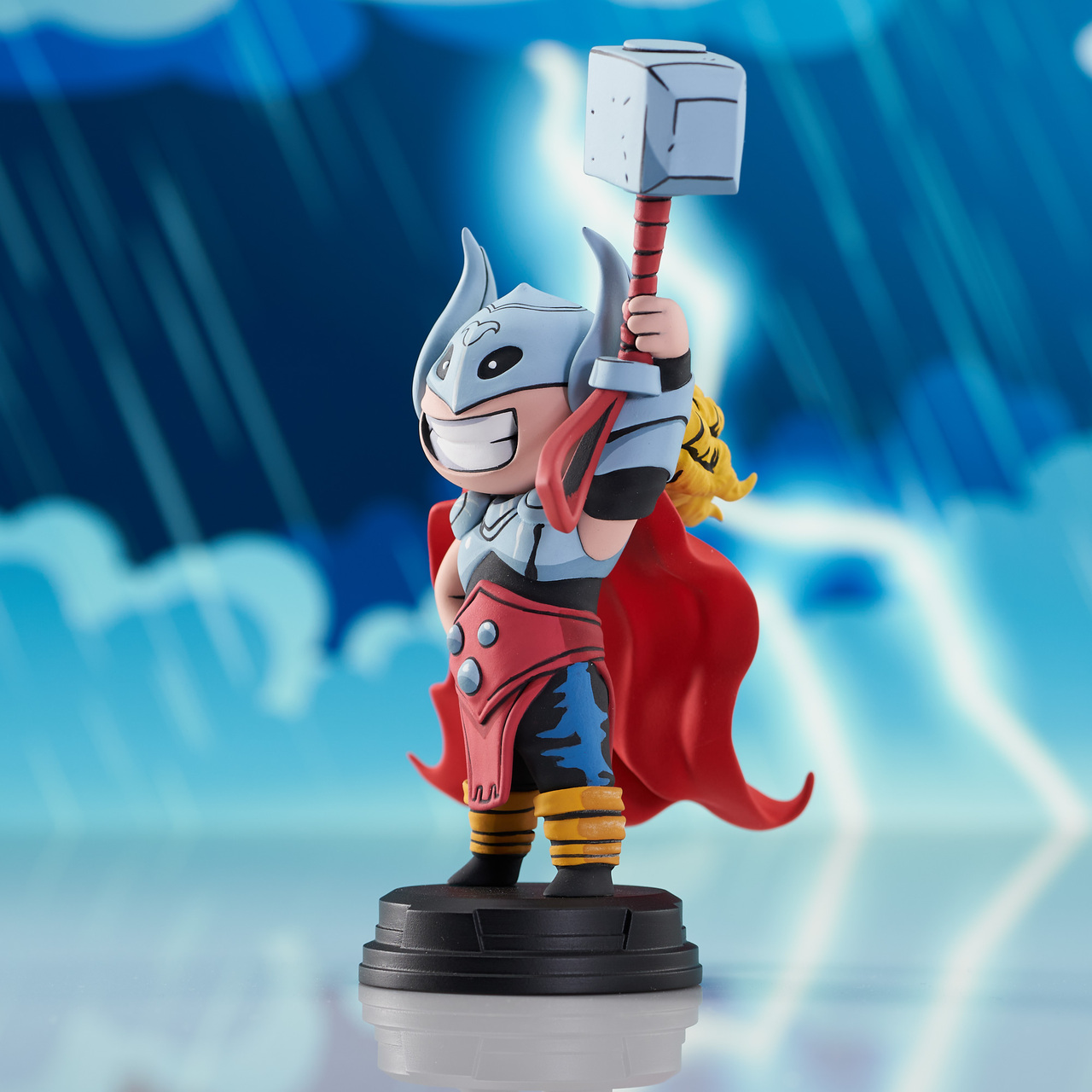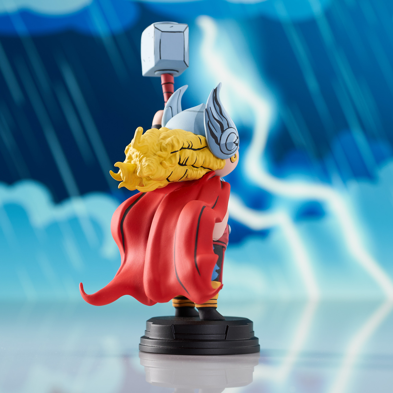 A Gentle Giant Ltd. release! With the world waiting to see how the new Thor will look and what shell do in Thor: Love and Thunder, Gentle Giant Ltd. is going back to her childhood for a new animated-style statue! Based on the variant cover artwork of Skottie Young, this approximately 5-inch resin statue of a cute young Jane Foster Thor features detailed sculpting and paint applications and is limited to 3000 pieces. It comes packaged with a certificate of authenticity in a full-color box. Sculpted by Casen Barnard.