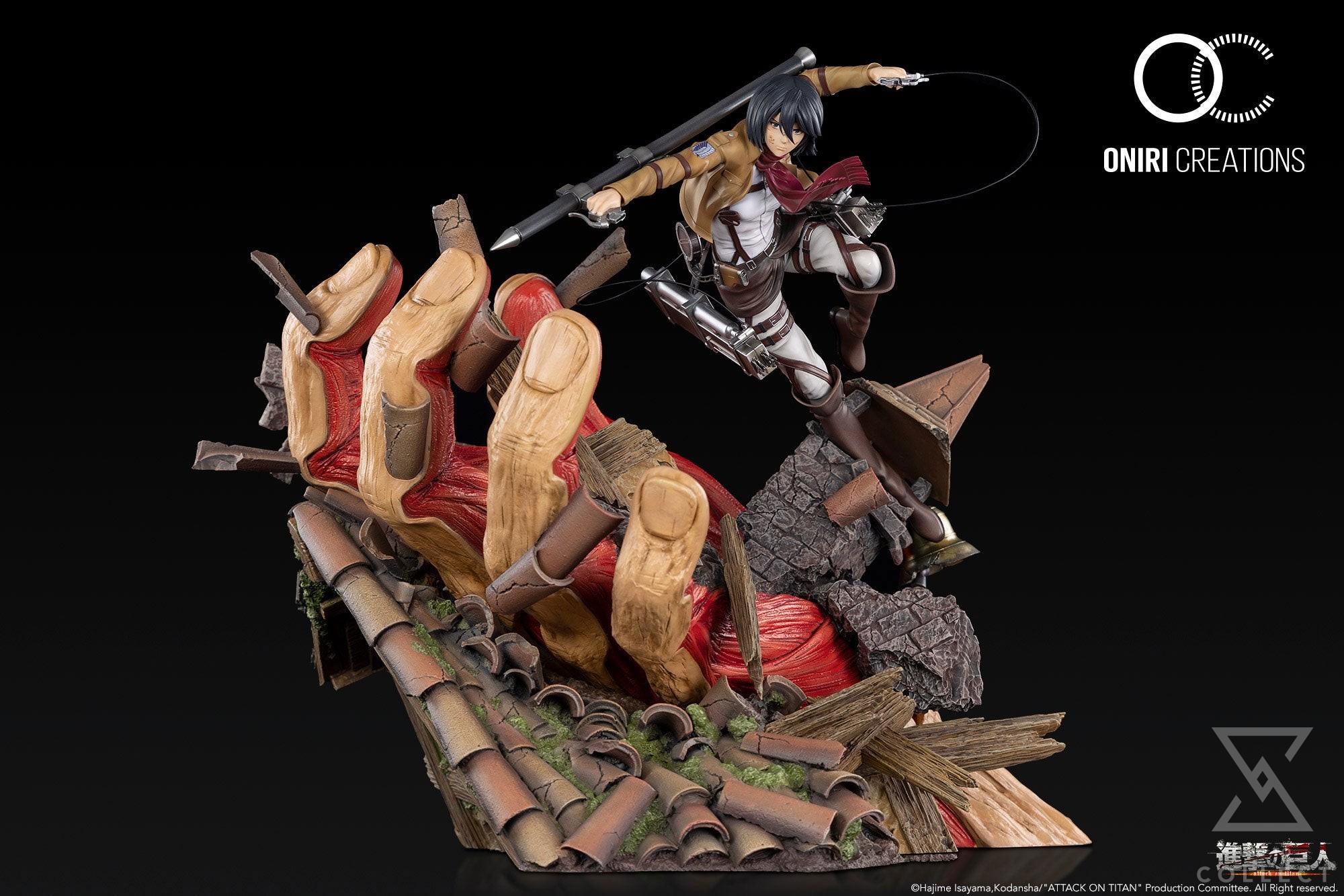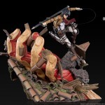 For this fight, Mikasa with a determined look and Eren’s scarf around his neck, is equipped with the lightning spear which will prove to be extremely effective against Reiner. It is suspended above the ruins of a house largely destroyed by the hand of the Titan who is in pursuit. Particular attention has been paid to detail and in particular to the representation of the house, whether in its architecture so characteristic of the anime, but also in the carving of wood and the painting of bricks. representation both realistic but also as faithful as possible to the anime.