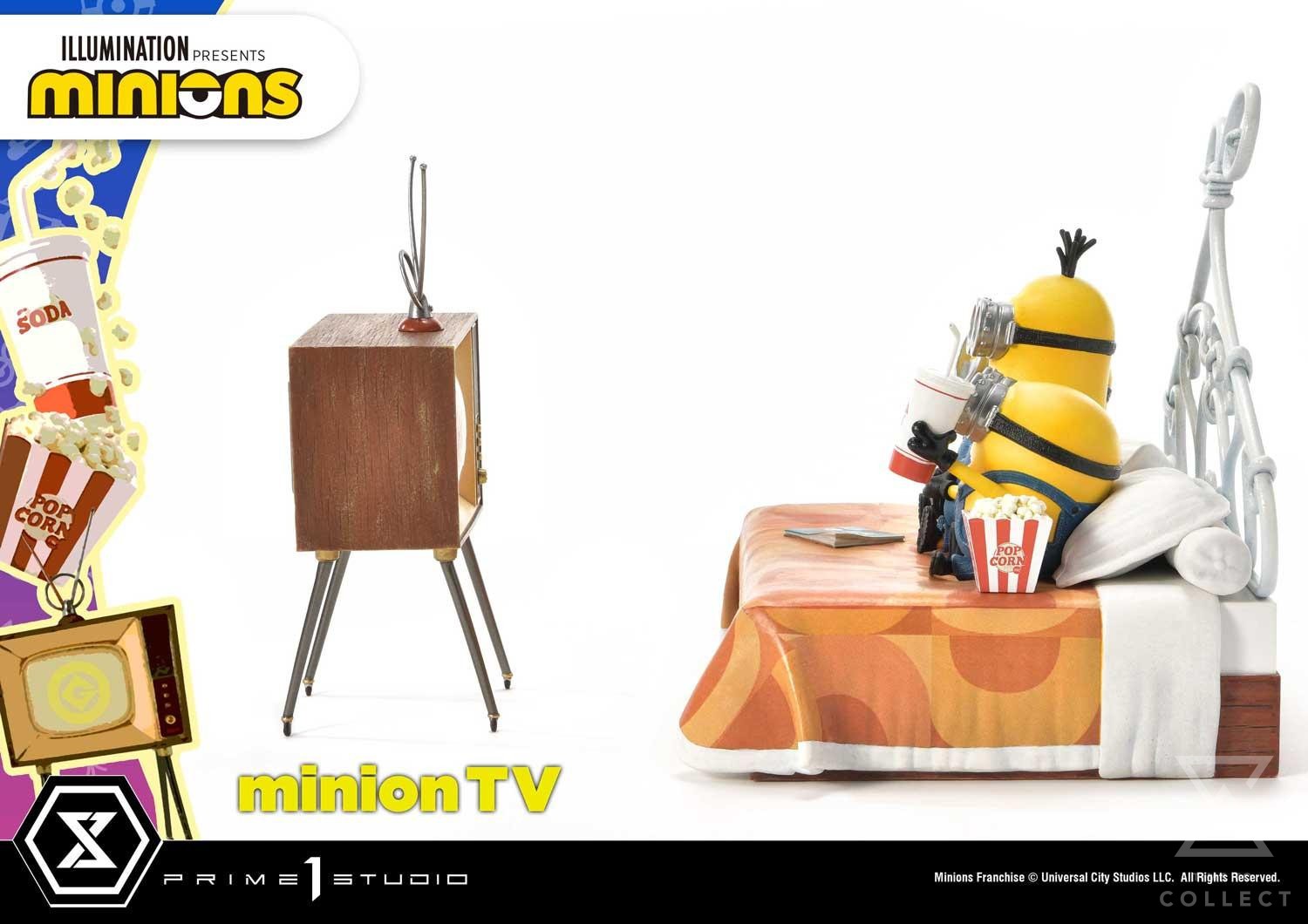Older than the dinosaurs and loyal to a fault, The Minions just want to help the evilest master they can find to fulfill their dreams. But Minions can’t work 24/7! There’s room for a little downtime every now and then. Prime 1 Studio is proud to present another Minions addition to our Prime Collectible Figure line: PCFMINI-11 Minions TV from The Minions! In this Minions TV set, Stuart, Kevin, and Bob are enjoying an afternoon of watching their favorite TV show: The Dating Game! It looks to be that the cyclopean Stuart is about as ready for the show as tall and lanky Kevin. Full of soda and popcorn, Bob looks to be regaling the boys with a story of wonder…or maybe he’s just telling a fart joke.