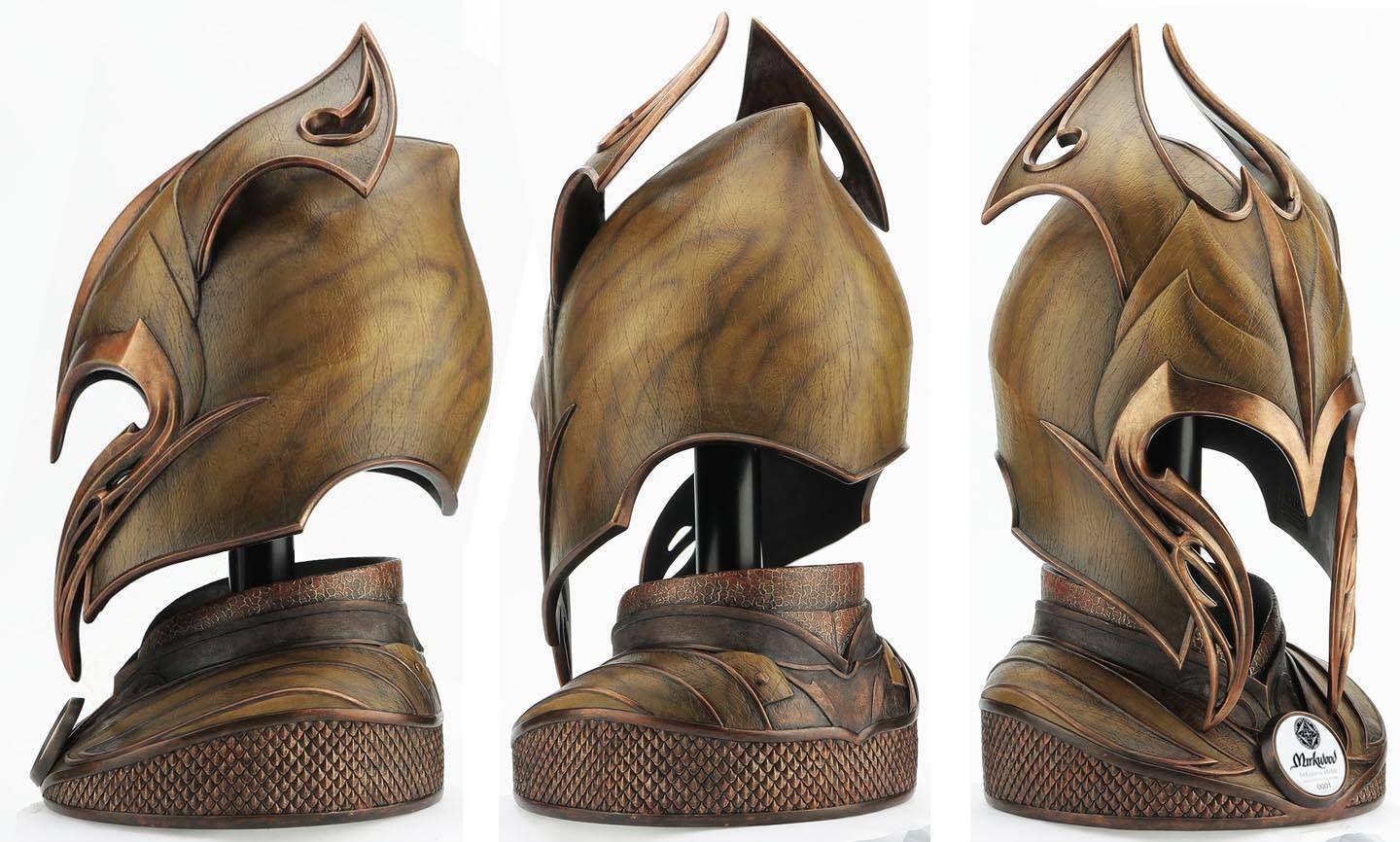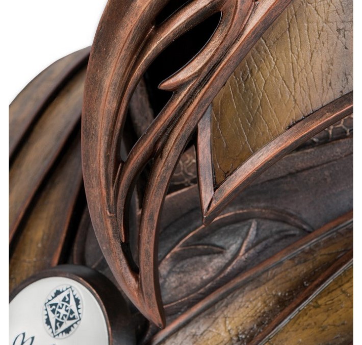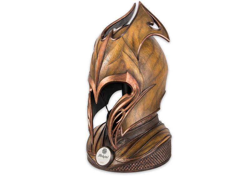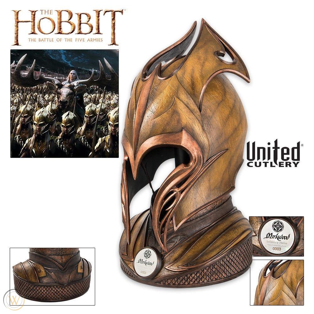 This authentically detailed replica is a reproduction of the actual filming prop used in the motion picture, THE HOBBIT: THE BATTLE OF THE FIVE ARMIES™, built by Weta Workshop of New Zealand. The helm is crafted of reinforced polyresin, with precisely-molded details and coloring, including weathering and aging effects to give it that bronze-like steel quality. It is presented with a polystone and wood display, sculpted in the shape of the Mirkwood infantry neck and shoulder armor. It includes a certificate of authenticity.