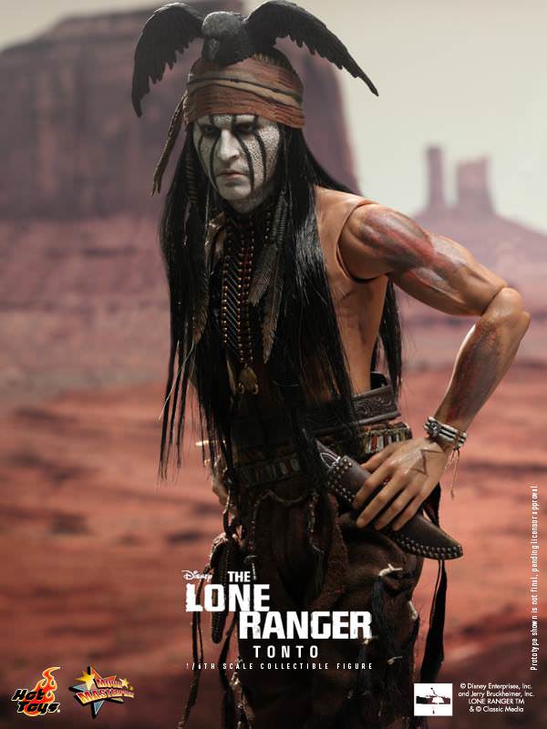 The movie-accurate Tonto Collectible Figure is specially crafted based on the image of Johnny Depp as Tonto in the movie which features a detailed head sculpt with face paint, real fabric hair, weapons and a number of finely-made tribal accessories.