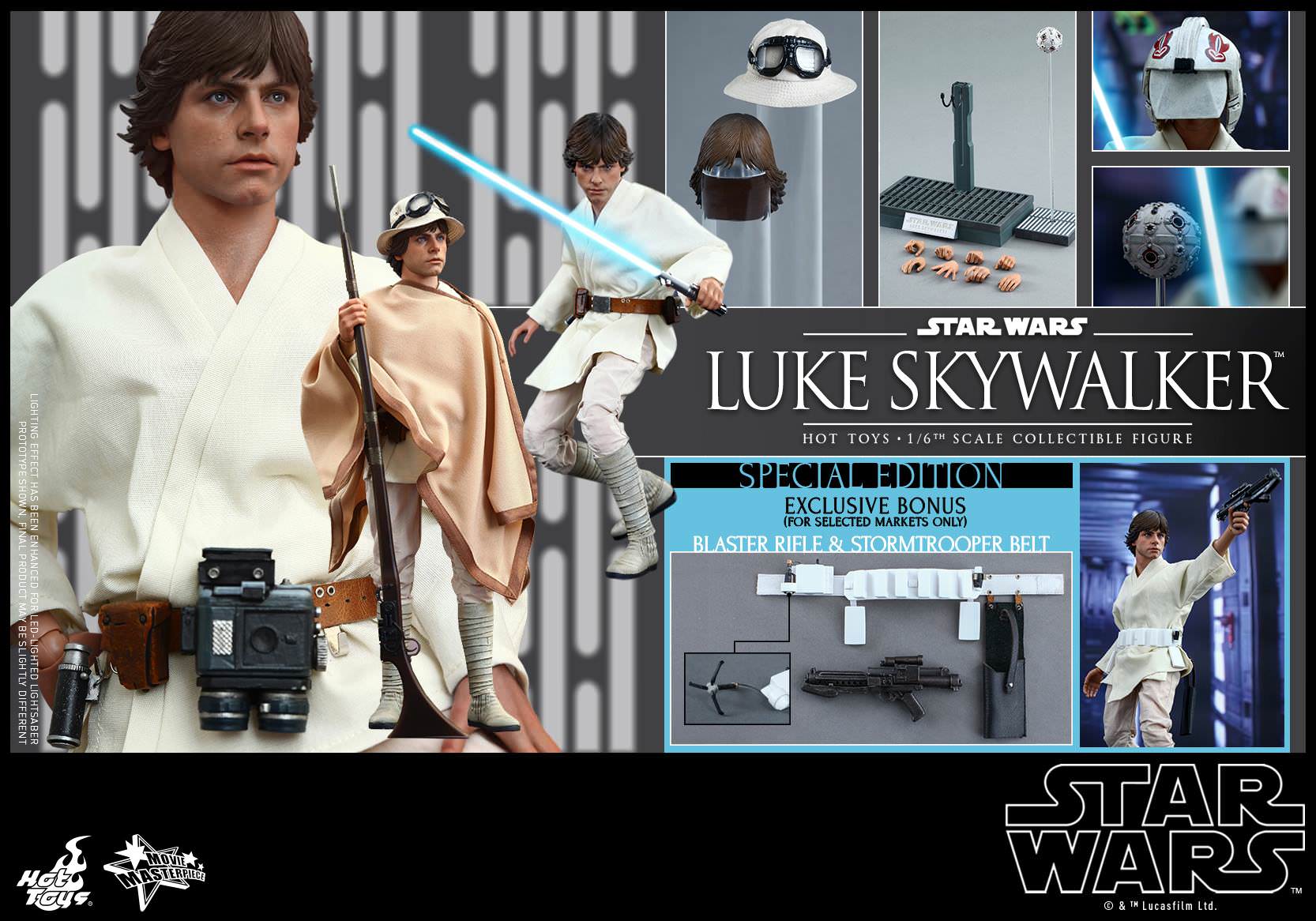 The movie-accurate collectible figure is specially crafted based on the image of Mark Hamill as Luke Skywalker in the film featuring a newly developed head sculpt, specially tailored costume, LED-lighted lightsaber, a hat with goggles, a poncho, detailed accessories, and a figure stand. A special edition is available in selected markets which include an additional Stormtrooper belt with grappling hook, a communicator, and a blaster rifle.