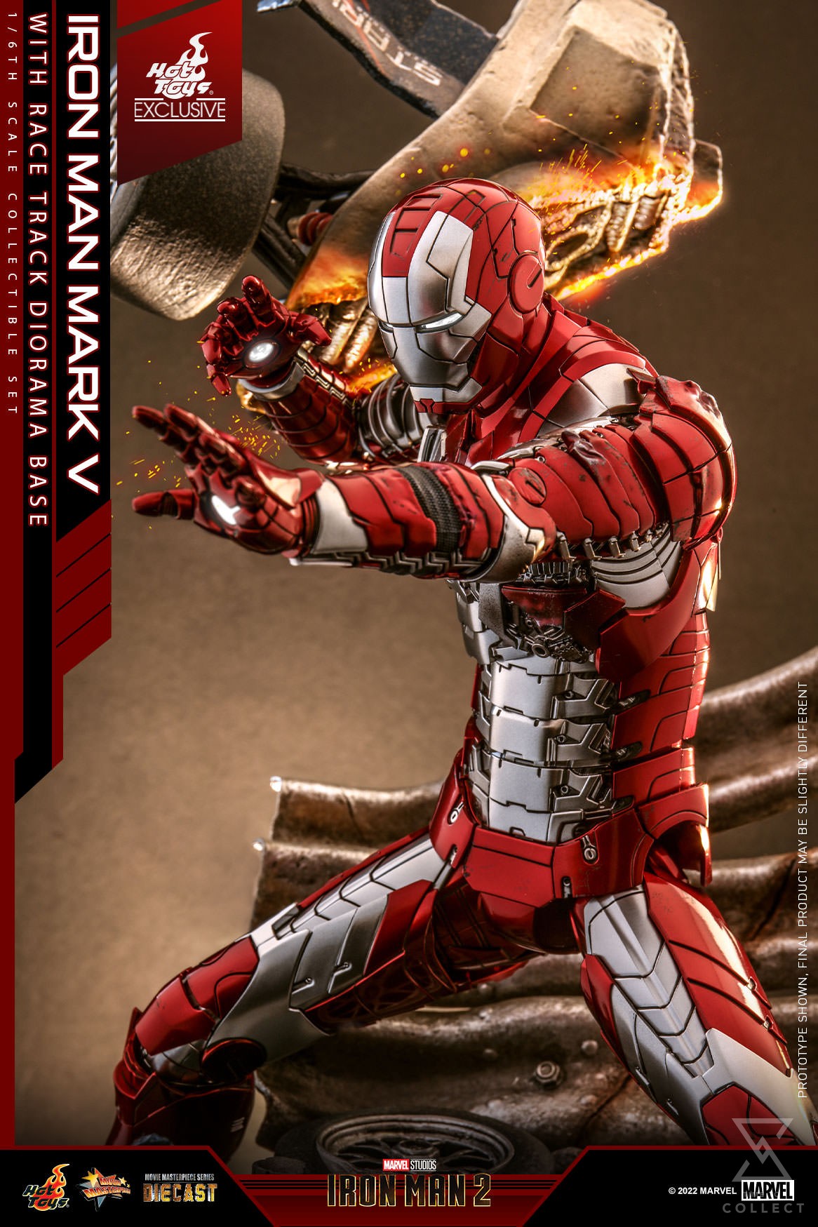 What’s more! The figure exclusively includes a highly elaborated diorama base reminiscent of the dramatic showdown between Iron Man and Whiplash, complete with damaged motor parts and guard rail from the circuit.
