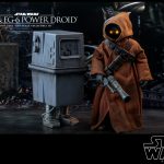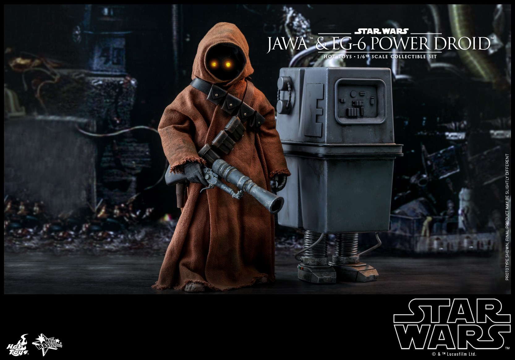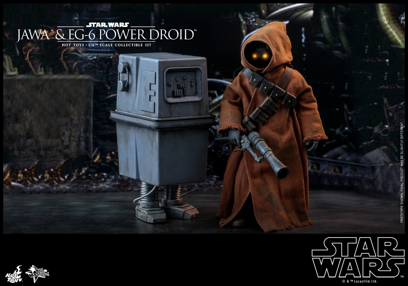 Meticulously created based on the appearance of the two characters in the movie, the 1/6th scale Jawa collectible figure features newly developed head with LED lights, skillfully tailored costume, variety of accessories, and a sand-themed figure base. The EG-6 Power Droid is finely crafted with detailed mechanical body with weathering effects, and also comes with a sand-themed figure base.