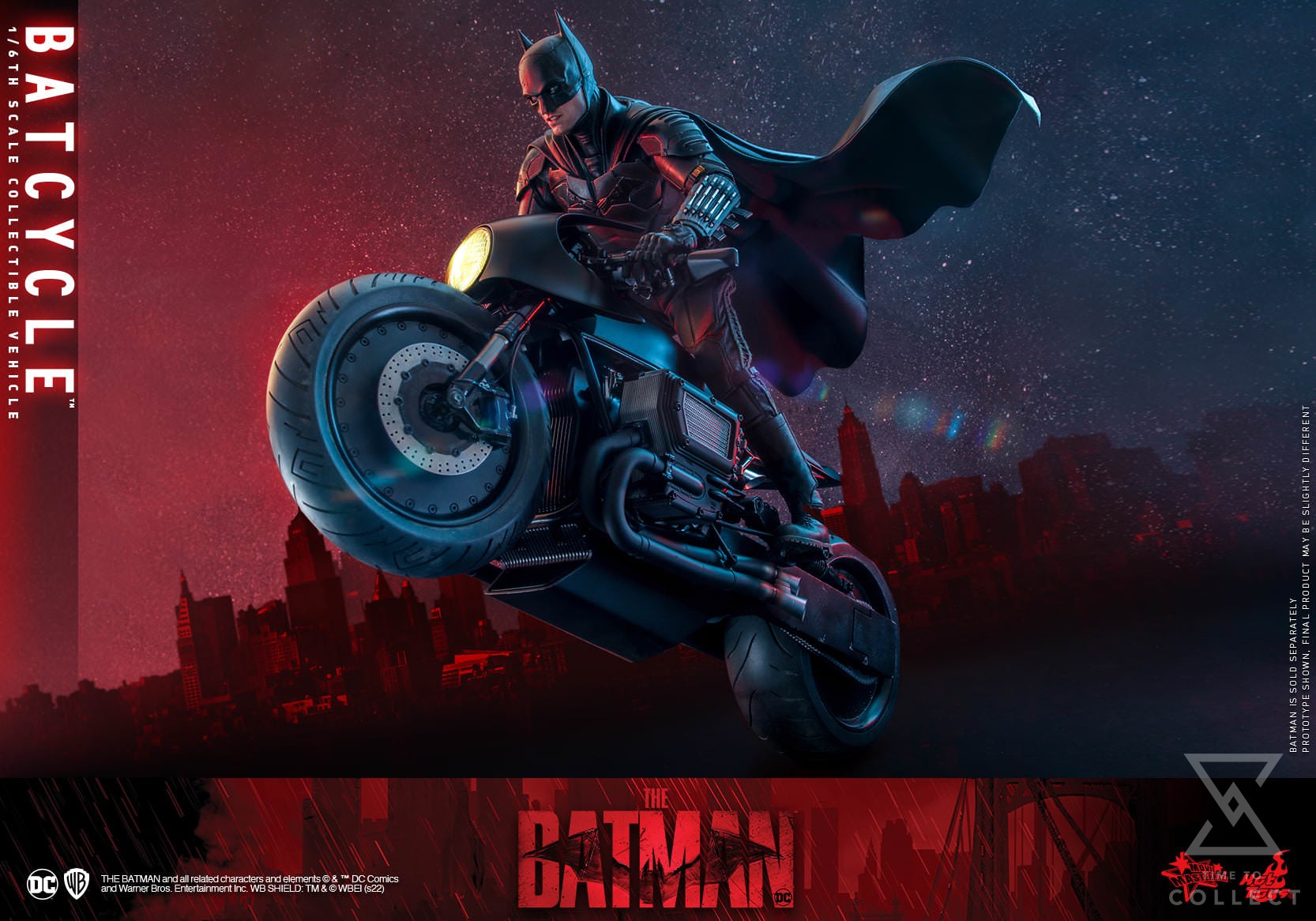 Based off of the vehicle seen in The Batman movie, the one-sixth scale Batcycle Collectible Vehicle is recreated with extreme precision and fine painting applications, measures 42cm in length, features LED light up function design on head and tail lights, adjustable-degree handlebar, rotatable rubber wheels given a realistic tread pattern, also highly-accurate mechanical details showcased on the engine, frame, dashboard, and exhaust, comes with display bases.
