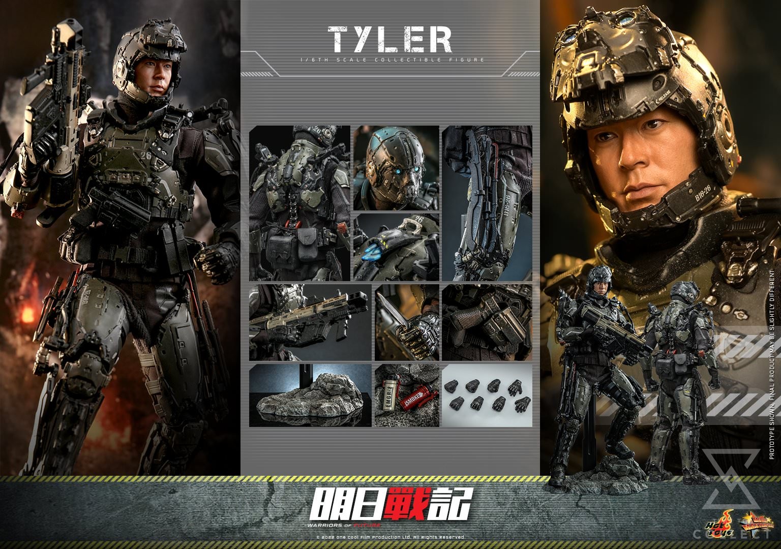 Meticulously crafted based on the appearance of Louis Koo as Tyler in the movie, the figure features a newly developed LED light-up helmeted head sculpt with impressive likeness, his dark green, black exosuit and mechanical exoskeleton weathered from battle, LED-lighted torch on shoulder, gear holsters on the delicate suit with greatly-detailed weapons such as heavy machine gun, blade, dagger, pistol, grenades, and a rocky themed diorama figure base.
