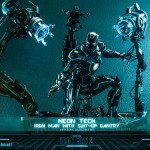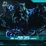 The diecast Neon Tech Iron Man figure stands approximately 32cm tall features an amazingly detailed armor in piano black and teal color applied with distinct luminous reflective patterns, LED light-up design on eyes, palms, lower chest and forearms, two sets of interchangeable forearm armors, and a pair of attachable lasers.