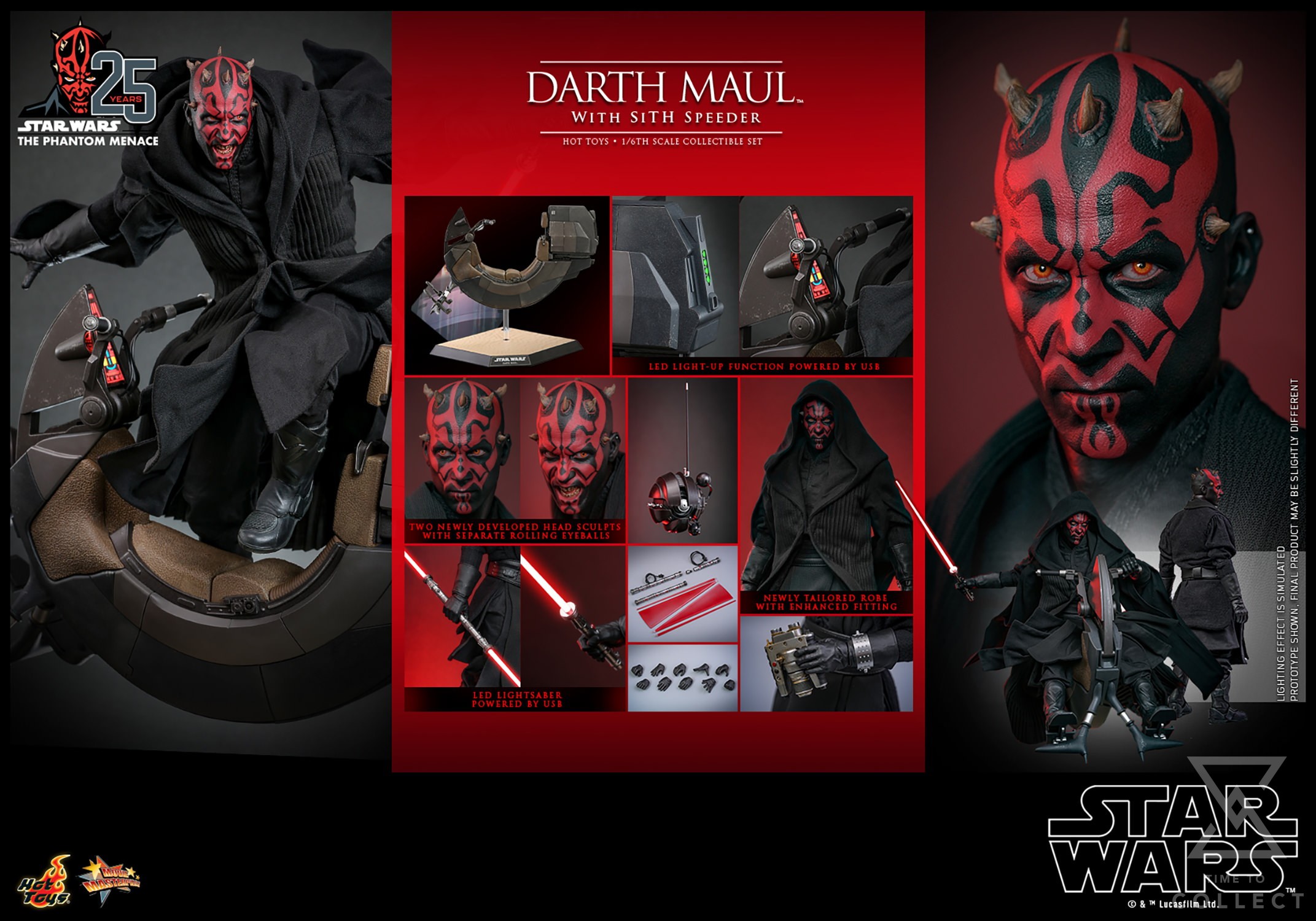 In celebration of the 25th anniversary of Star Wars Episode I: The Phantom Menace, Sideshow and Hot Toys is especially releasing the Darth Maul with Sith Speeder Collectible Set. Enjoy an even more refined and impressive rendition of the Darth Maul action figure with the interchangeable head sculpts that captured his intense expressions, and the outfit that were carefully recreated to ensure the highest level of authenticity.