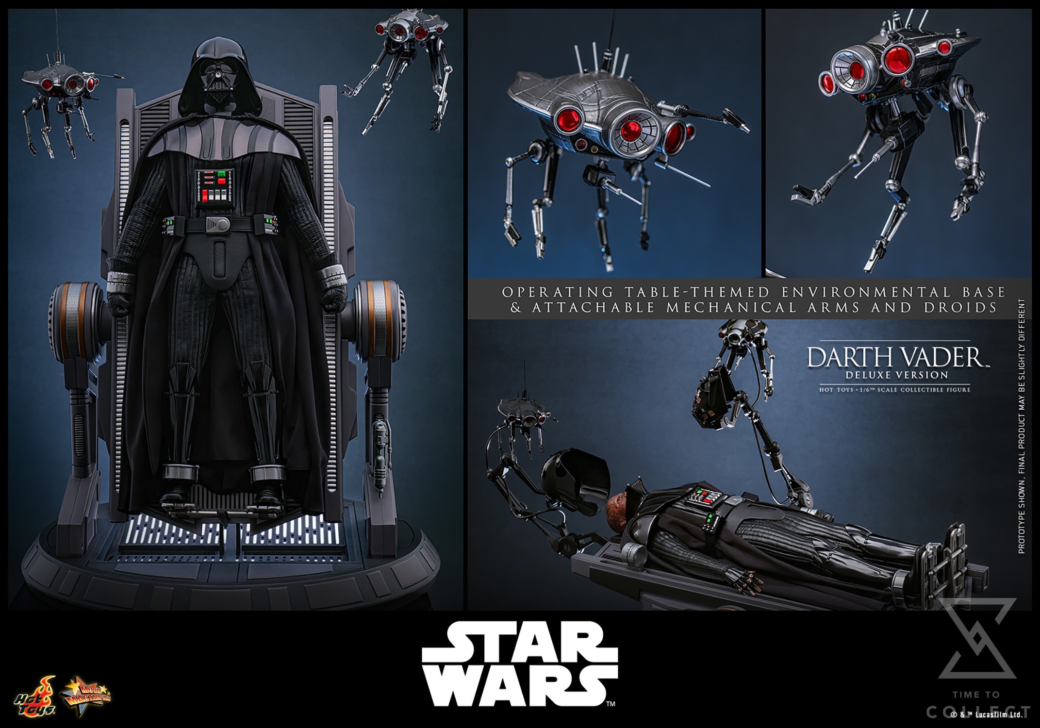 - Two (2) mechanical arms – One (1) for holding Vader’s helmet dome and One (1) for holding Vader’s face mask (attachable to operating table diorama base)*