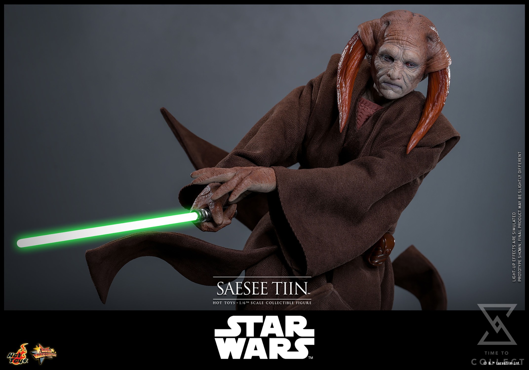 Hot Toys is proud to unveil the 1/6th scale Saesee Tiin Collectible Figure, a tribute to this noble Jedi Master. Crafted with a brand-new head sculpt featuring a rolling eyeball mechanism and screen-accurate facial patterns, the figure captures Tiin’s distinctive appearance and textured skin. Equipped with five interchangeable hands and three gloved hands, including hands for holding the lightsaber and using the Force, this figure offers versatile display options. Tiin’s costume is faithfully tailored, featuring a wired belt-embedded outer robe layered over an undershirt, pants, long boots, and a wired Jedi robe to recreate his Jedi Master look. Weapons and accessories include a green LED-lighted lightsaber with switchable blades and forearm armor. Notably, the forearm armor pieces are inspired by Tiin’s appearance in the Clone Wars animated series.