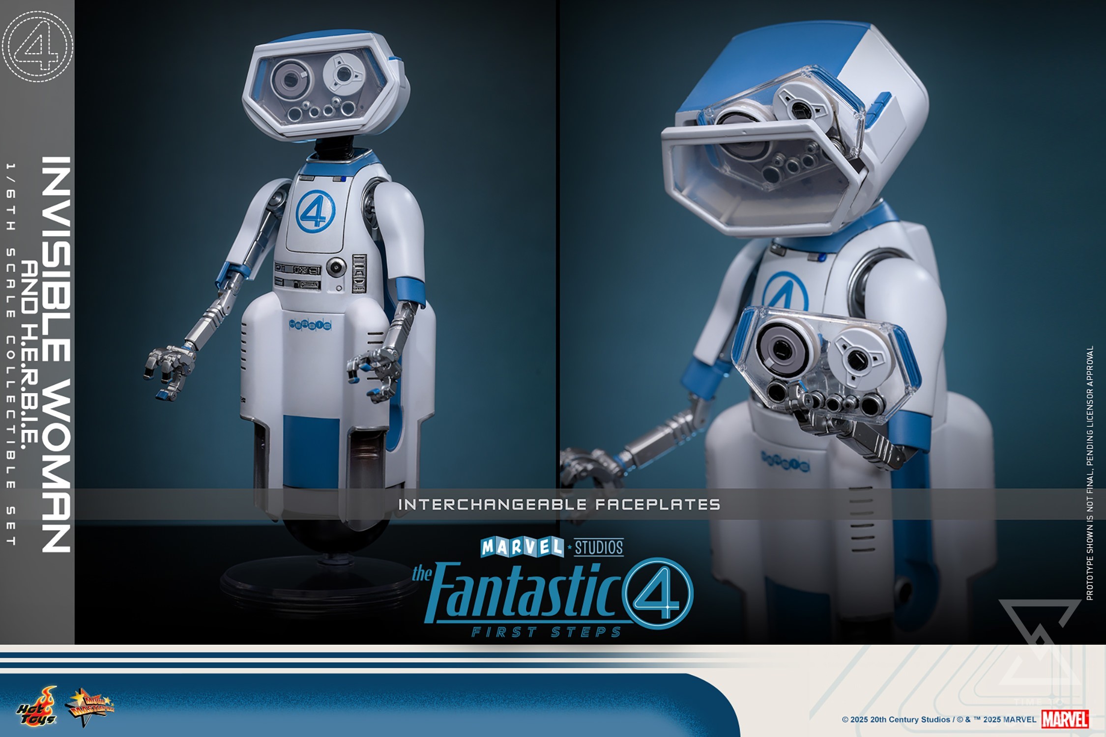 The collectible set features a Invisible Woman Sixth Scale Collectible Figure and a H.E.R.B.I.E. Sixth Scale Collectible Figure. The Invisible Woman figure showcases a newly developed head with rolling eyeballs and meticulously sculpted icy-blonde hair that reflects Vanessa Kirby’s likeness. She is dressed in her retro-futuristic Fantastic Four uniform, complete with a coordinating belt and boots. The figure offers nine interchangeable hands, both gloved and ungloved, allowing collectors to showcase her in relaxed stances or ability-using poses. Accessories include a translucent holographic force-field effect to recreate her energy shields and a baby Franklin Richards nestled in a cradle covered by a removable lid. The H.E.R.B.I.E. Sixth Scale Collectible Figure features an articulated head, mechanical arms and fingers, two interchangeable faceplates that recreate different expressions, and a transparent ball joint figure stand.