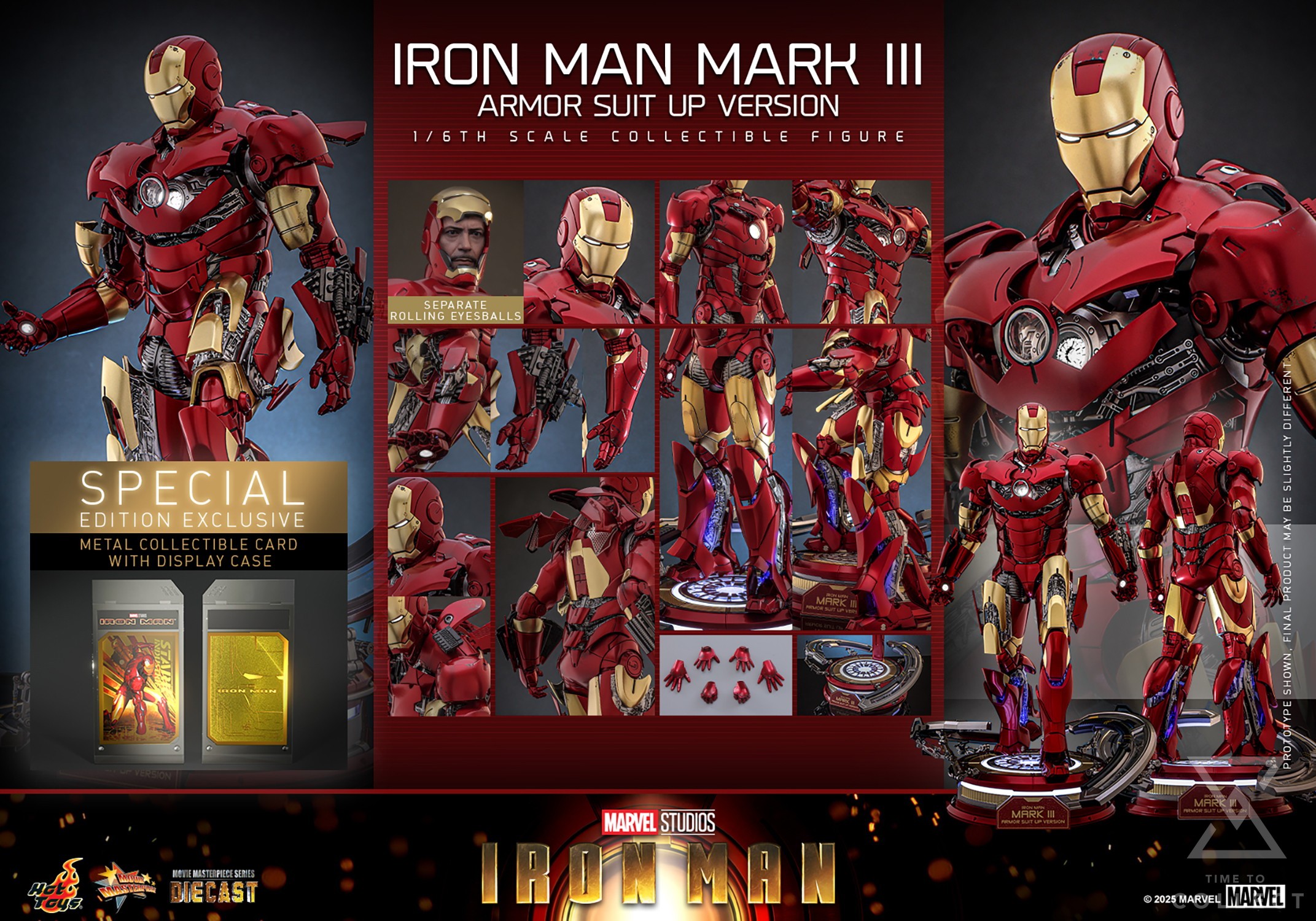 This sixth-scale diecast collectible figure marks a milestone for Hot Toys, it’s the first to feature a Tony Stark helmeted head sculpt with separate rolling eyeballs, bringing an authentic, dynamic expression to your Iron Man display. Armor components on the chest, back air flaps, shoulders, upper arms, abdomen, lower back, thighs, shins, and calves can be opened to simulate the dynamic suiting-up process. Inside, electroplated inner mechanical structures are revealed, making this figure as much a piece of engineering art as it is a collectible. LED lights illuminate the helmeted eyes, palms, Arc Reactor, shins, and calves in crisp white and blue tones, showcasing Stark’s high-tech core. Accessories include shoulder-mounted guns, forearm armors in protection shield mode, forearm rockets in firing mode, and three pairs of hands for varied battle poses. A specially designed figure stand in metallic red, silver, and gold includes two articulated diorama pieces to support your dynamic suit-up setup. The base features LED integration to light up Iron Man from below. Special Edition only available in selected markets will include a specially designed Iron Man Mark III metal collectible card with display case.