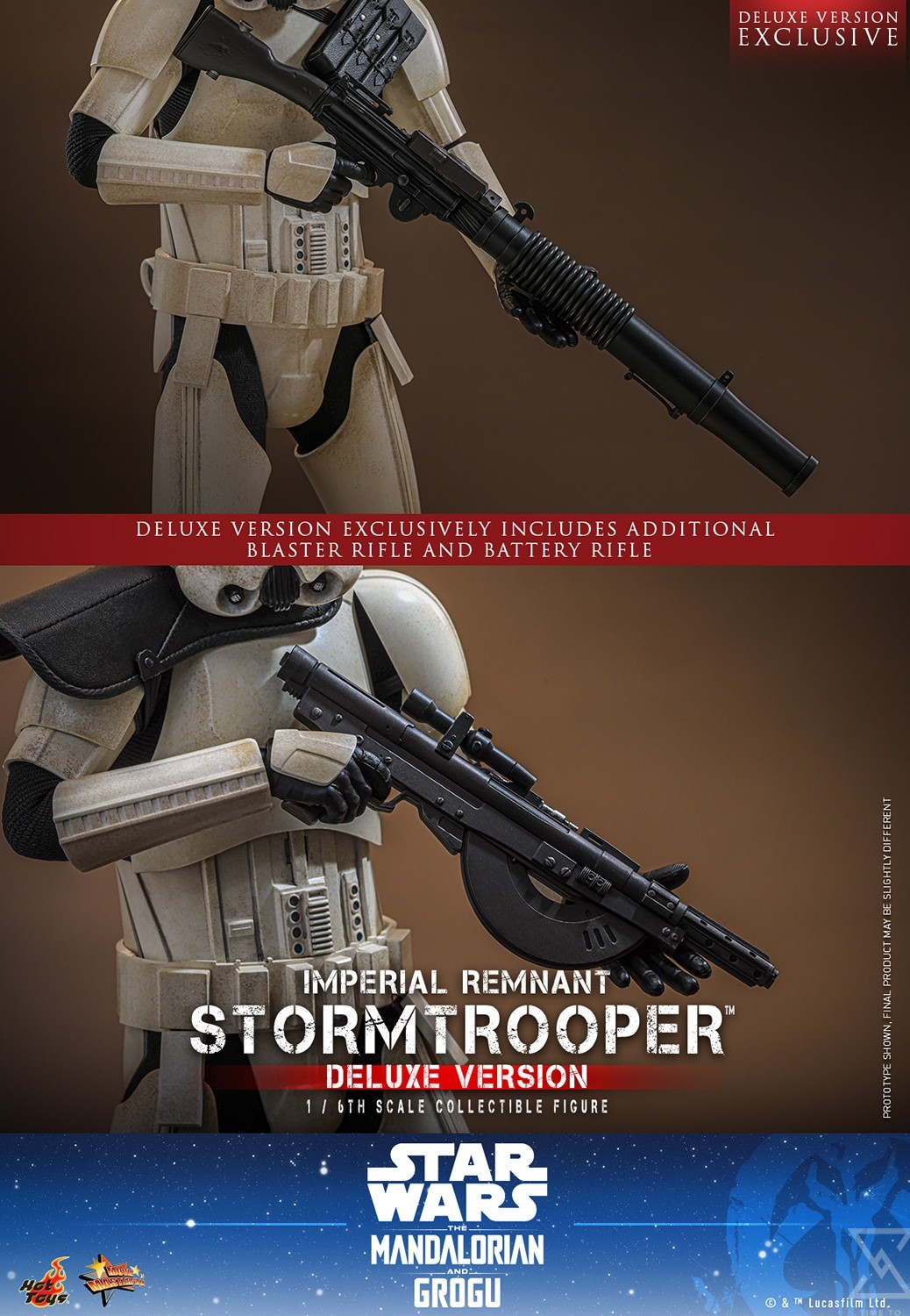 This Deluxe Version offers a range of exclusive accessories to recreate a total of 4 display modes for specific scenes, including a black epaulet, dark brown arm band, black shoulder bag, and yellowish-brown shin guard. Beyond the standard-issue E-11 blaster rifle and SE-14r blaster pistol, this version packs heavy-duty firepower with the addition of a T-21 blaster rifle and an all-new battery rifle!