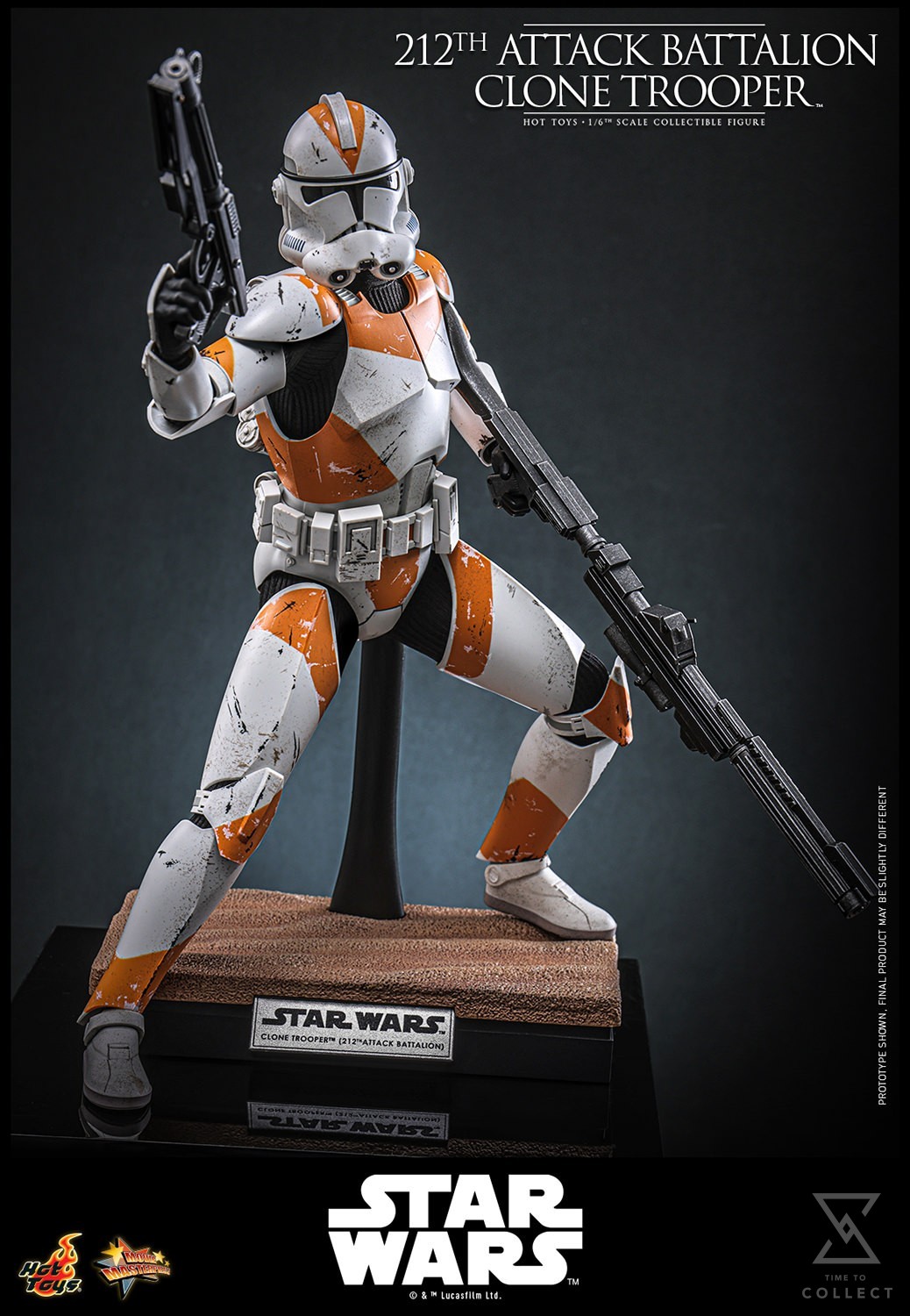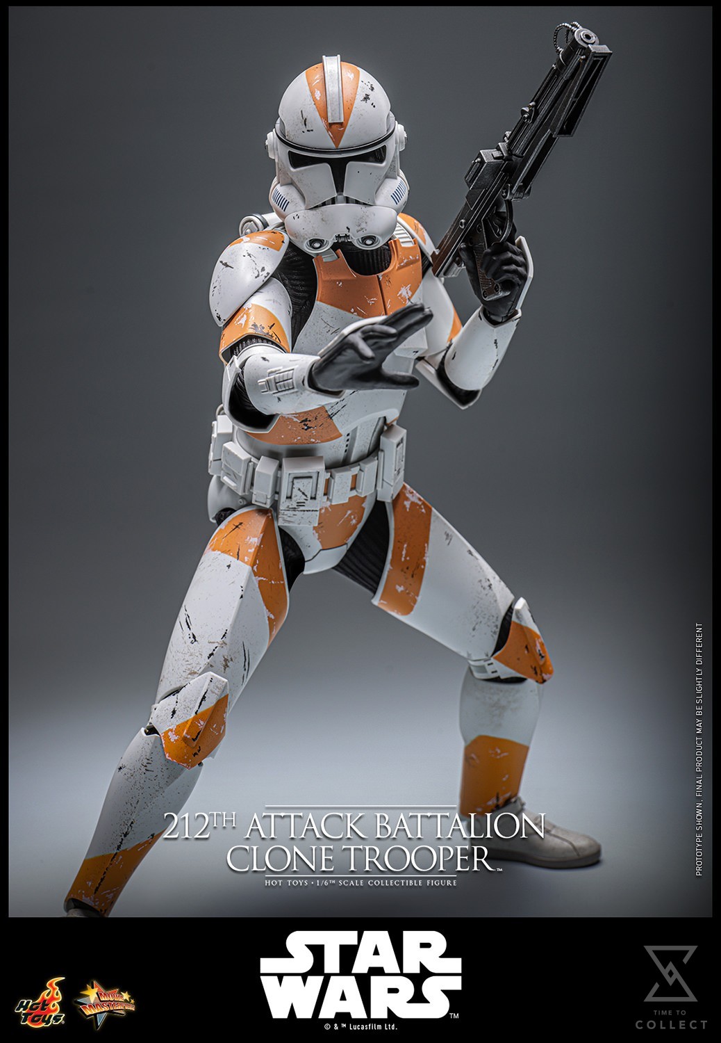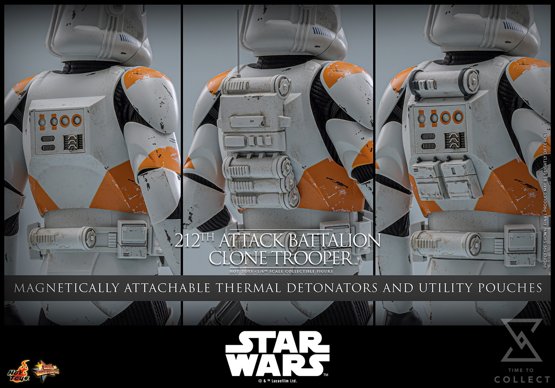 Sideshow and Hot Toys are excited to present the 212th Attack Battalion Clone Trooper™ Sixth Scale Collectible Figure, meticulously crafted to honor the valor and legacy of this iconic unit. The Star Wars action figure features a finely crafted helmeted head with battle weathering. Dressed in a finely crafted set of white armor painted with bold orange patterning and weathering effects, the trooper’s uniform replicates the worn armor as seen in the film. His utility belt is accented with orange detailing, and his boots also show authentic wear from countless engagements.