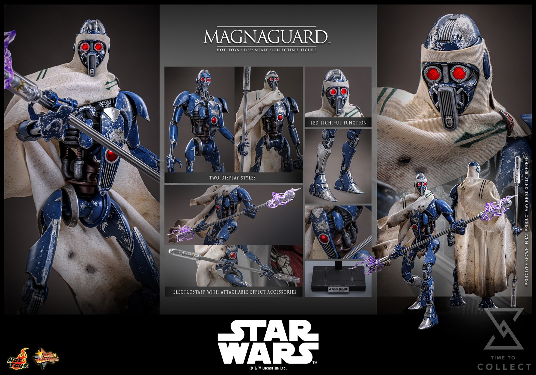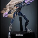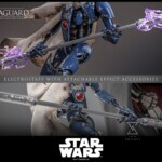 The MagnaGuard comes outfitted in a beige cloak with green stripes, battle-damaged details, and realistic weathering effects, faithfully capturing its frontline combat appearance. Equipped with its signature electrostaff, collectors can also attach the translucent purple lightning effect accessory to recreate its charged, deadly strikes. To complete the display, a specially designed figure stand with the Star Wars logo and character nameplate is included.