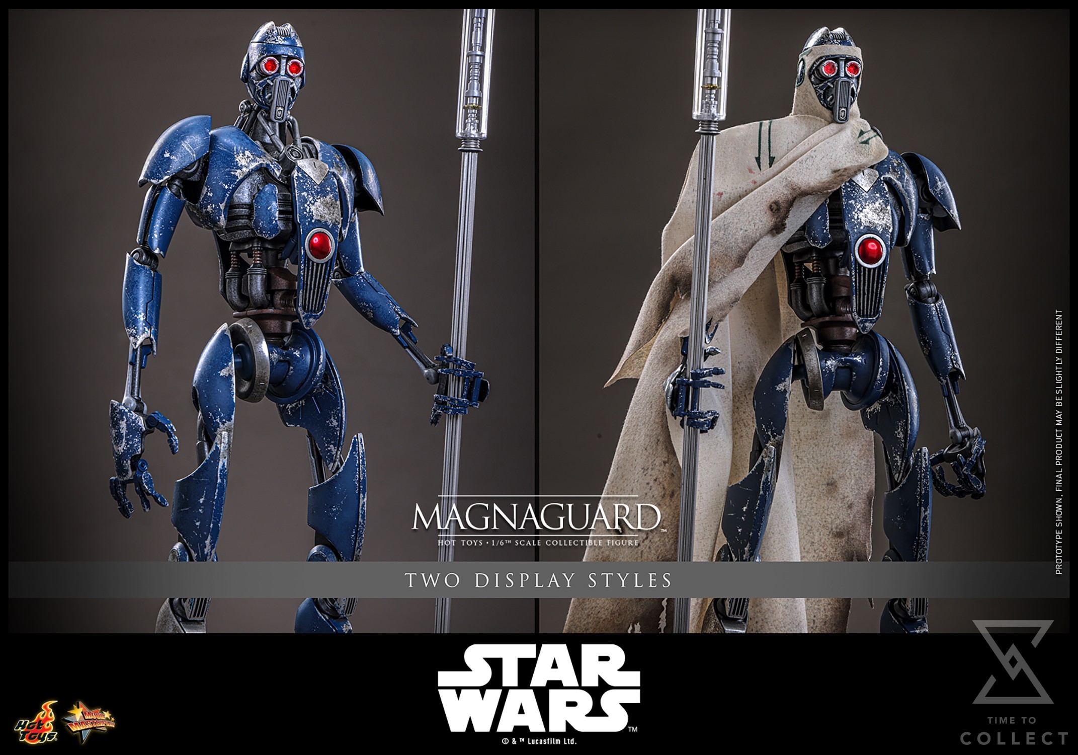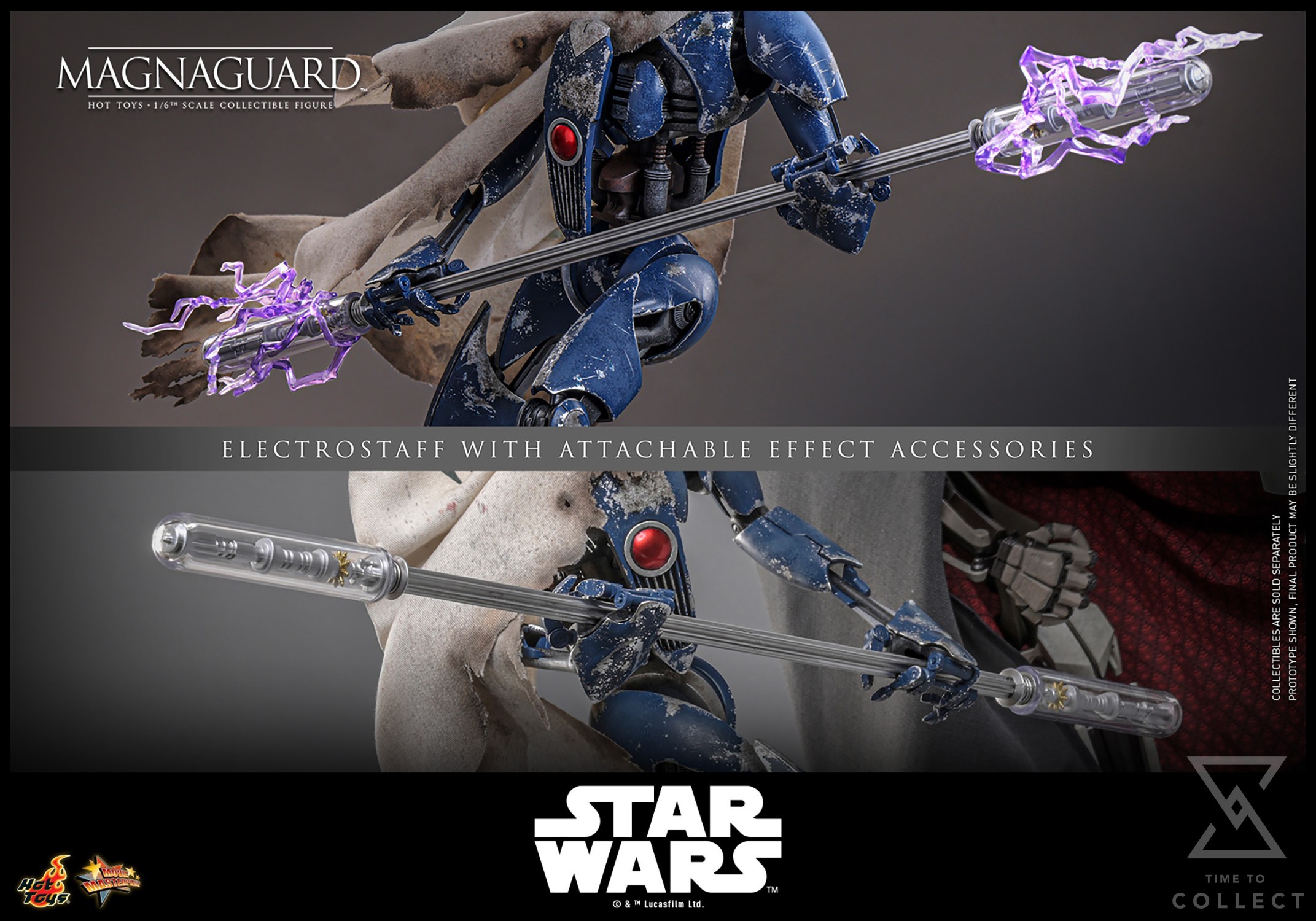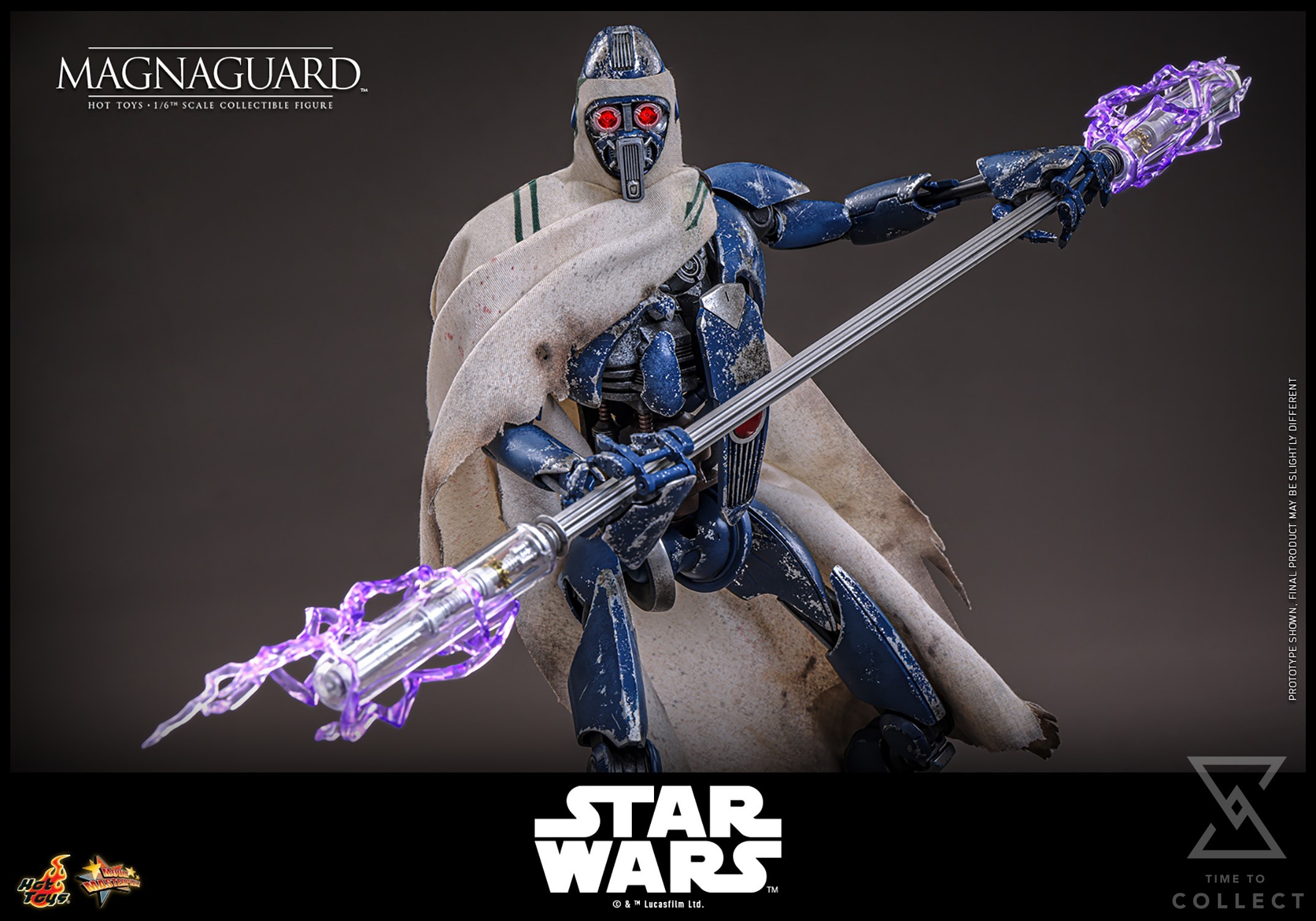 The MagnaGuard comes outfitted in a beige cloak with green stripes, battle-damaged details, and realistic weathering effects, faithfully capturing its frontline combat appearance. Equipped with its signature electrostaff, collectors can also attach the translucent purple lightning effect accessory to recreate its charged, deadly strikes. To complete the display, a specially designed figure stand with the Star Wars logo and character nameplate is included.