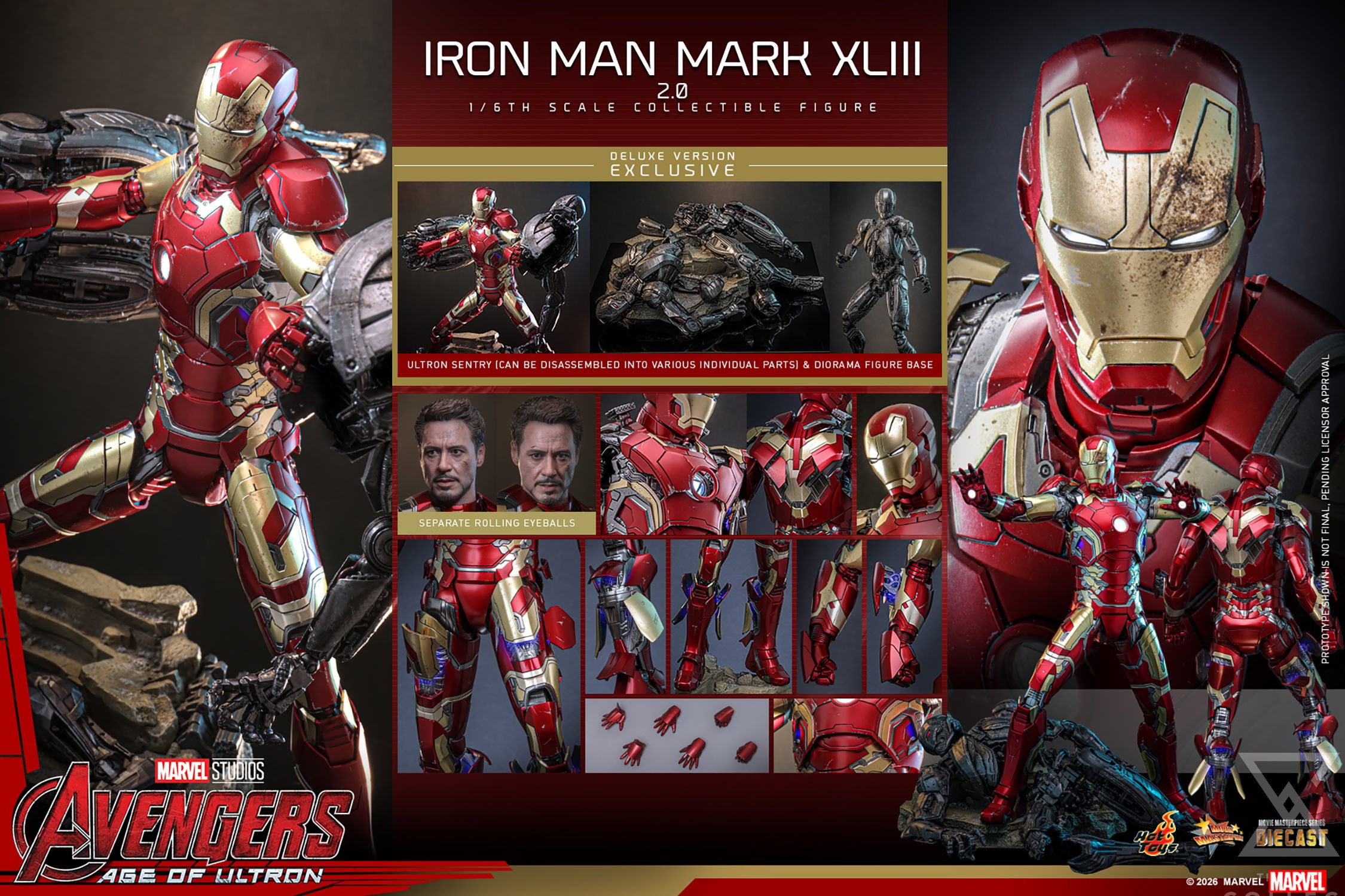 - Authentic and detailed likeness of Robert Downey Jr. as Tony Stark wearing the Iron Man Mark XLIII armor in Avengers: Age of Ultron