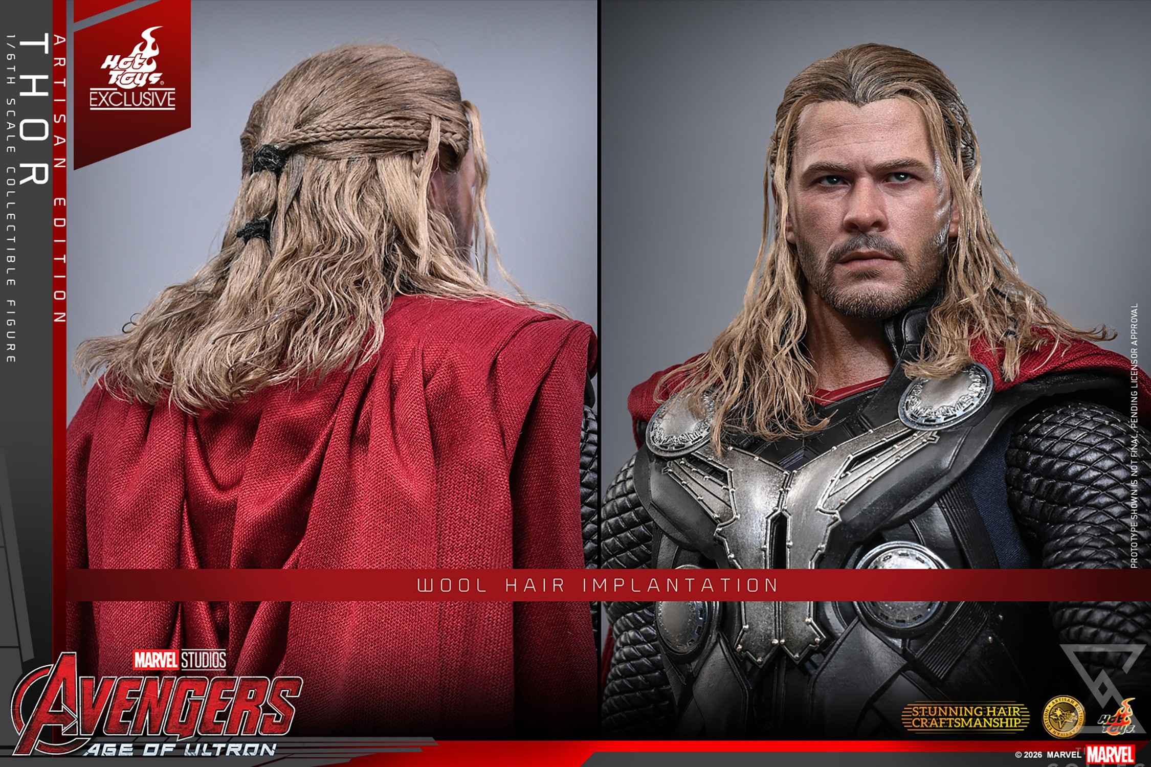 Sideshow and Hot Toys proudly presents the highly anticipated Thor Sixth Scale Collectible Figure (Artisan Edition). The newly developed head sculpt features separate rolling eyeballs, detailed beard, and lifelike skin textures to perfectly capture Chris Hemsworth’s portrayal. Elevating this Artisan Edition is Thor’s meticulously implanted long blonde hairstyle, expertly styled from wool material into flowing waves with braided sections and hair tie details. The sixth scale figure features a muscular body with two sets of interchangeable arms. One pair made of silicone and another scale-armored pair made of soft vinyl — all constructed with inner metal skeletons for a seamless joint design. A selection of ten interchangeable hands supports a wide range of dynamic gestures, from summoning to wielding Mjølnir in battle.
