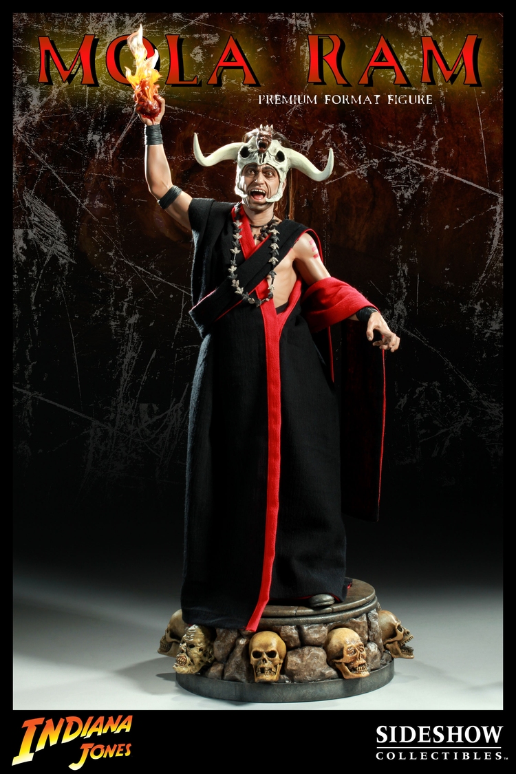 The Mola Ram Premium Format figure presents one of Indiana Jones’ most memorable adversaries in stunning detail. Each piece is individually painted and finished to exacting standards, each with its own unique quality and detail that is the trademark of a handcrafted Sideshow Collectibles product. Clothed in real fabric robes and wearing two detailed necklaces, Mola stands over 25 inches tall atop a base adorned with eight unique skulls. Mola Ram comes complete with two switch-out heads, featuring a headdress option with real hair detailing, and two switch-out hands, including a human heart engulfed in flames. The Mola Ram Premium Format Figure is the perfect addition to any display, an essential part of your Indiana Jones collection.
