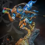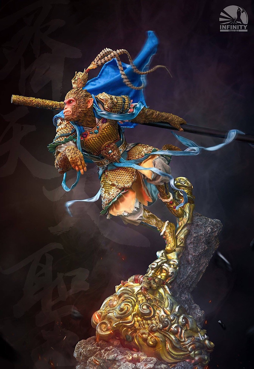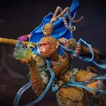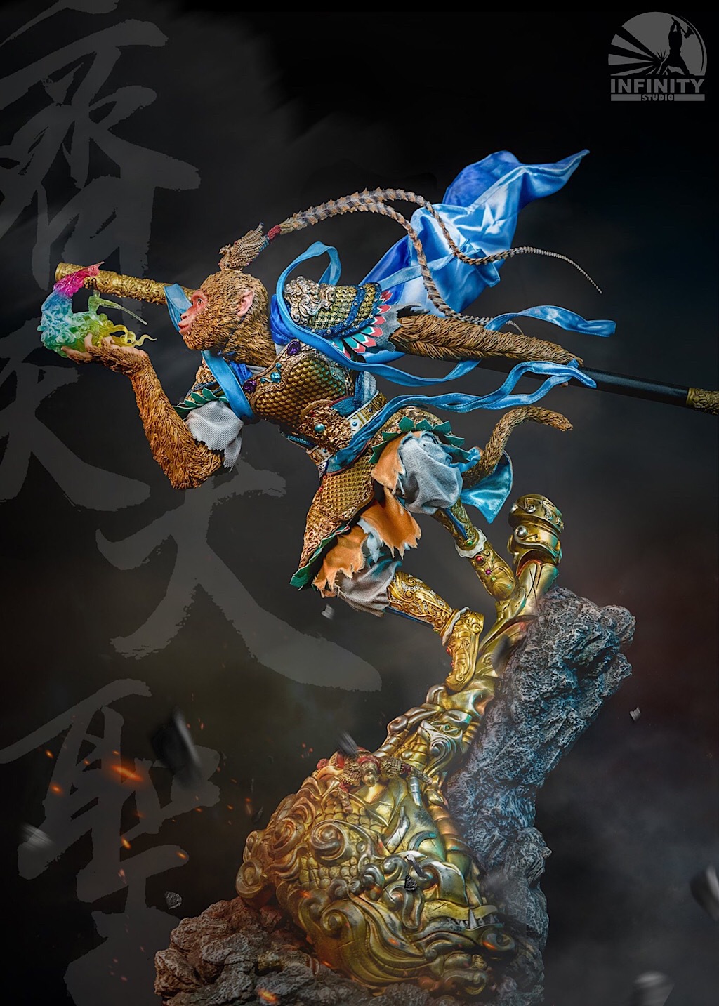 This work wants to highlight the Monkey King’s naughty and capricious character in the original work, which is monkey nature. The shape is a huge qi tian da sheng, is blowing hair, the backhand is holding the staff of the golden hoop, the foot is stepping on the god hammer of the giant spirit god, around is the wounded soldier of heaven. Neither the United States department nor Japanese department, do the Chinese wind qi tian da sheng!