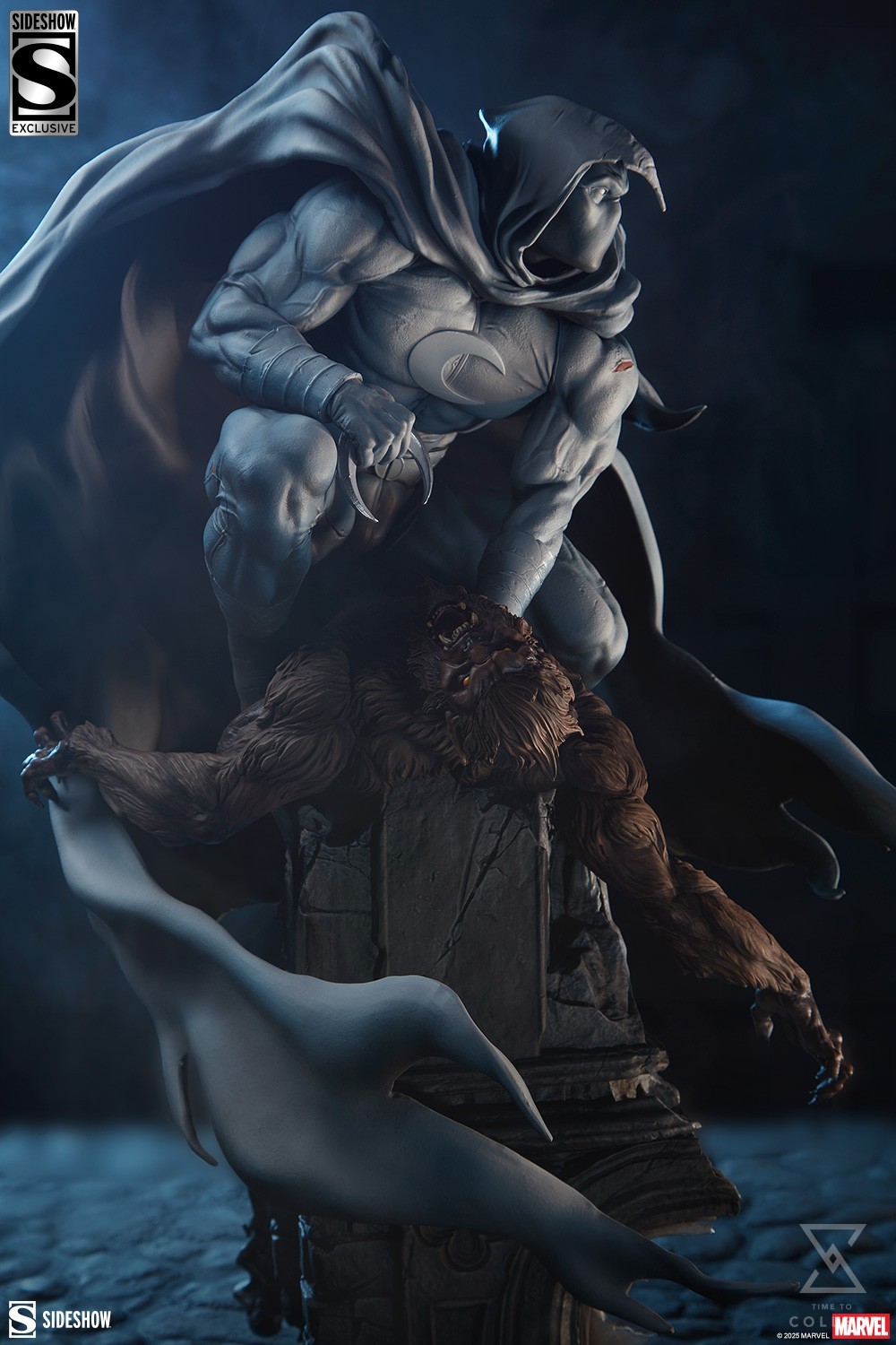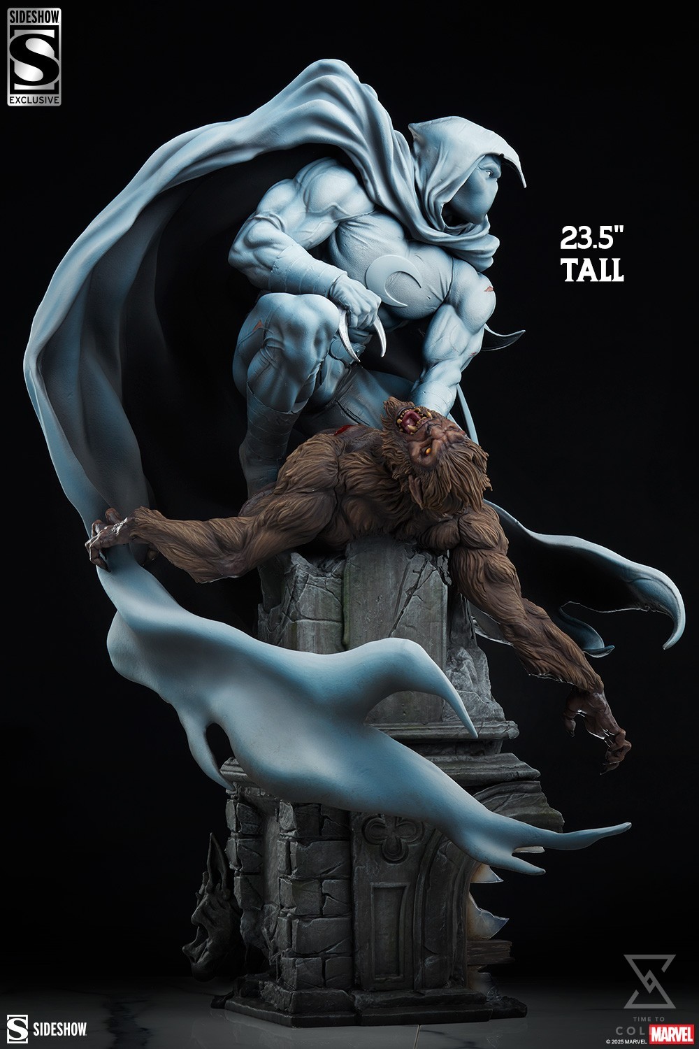 A man with the power of the moon versus a man transformed by it! Measuring 23.5” (59.69cm) tall, 12.9” (32.77cm) wide, and 15.9” (40.39cm) deep, the Moon Knight Premium Format™ Figure features the Fist of Khonshu in an eternal entanglement with Werewolf by Night. These classic rivals clash atop a dilapidated pillar, with rubble, shattered glass, and cracks in the foundation exhibiting an epic struggle. Moon Knight seems swathed in liquid fog and moonlight, his cloak spilling around himself and the snarling lycanthrope. Meanwhile, Werewolf by Night’s claws and fangs are bared ferociously, yet the deep, crescent-shaped wounds on his chest reveal the true victor of tonight’s duel.