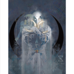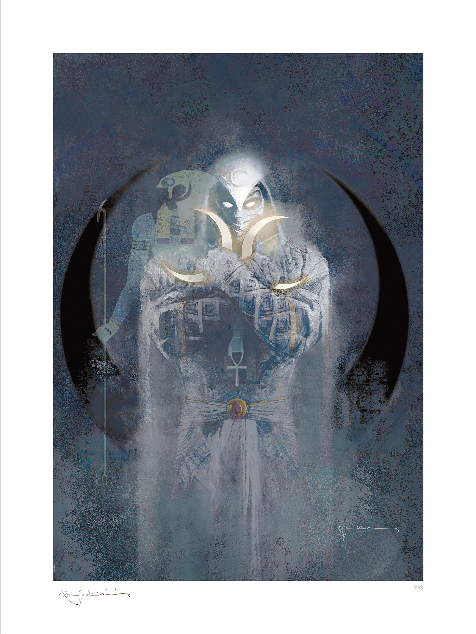 As the Avatar of Khonshu, Egyptian god of the moon, Marc Spector is tasked with shining a light in the darkness. He dons the persona of Moon Knight in order to punish those living in the shadows of evil. This moody illustration by Bill Sienkiewicz shows the astral glow of Marc’s crescent moon blades as he embraces the chaos that comes from the changing lunar cycle and his own life in service of Khonshu.