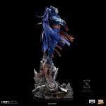 With a white skin as cold as marble, red eyes with no pupil, and sharp teeth, his appearance justifies his name. Genetically transformed, one of the brightest geneticists in the world enhanced his transformation for years, incorporating the genetic material of certain mutants into his DNA to get more abilities. Using his telekinetic powers that allow him to levitate, the unique villain floats over the mechanic debris of a Sentinel robot on fire, probably from its recent destruction. With the ability to control each molecule from his body, capable of absorbing the impacts and regenerating any damage, of altering and modifying his mass with a shape-shifting ability that allows him to assume the form of anyone, together with many other powers such as telepathy, concussive blasts, speed, endurance, strength, and superhuman senses, make him one of the most dangerous and lethal enemies of the X-Men. Using his classic look with an armor in shades of blue, silver, and red, with a cape of strips expanding from his back like wings, Iron Studios bring the statue “Mr. Sinister – X-Men – BDS Art Scale 1/10”, with the villain master of manipulation and strategic thinking, one of the most requested characters by fans and collectors for the collection of statues that compose the battle diorama of the X-Men facing the Sentinel robots controlled by Magneto and many other villains.